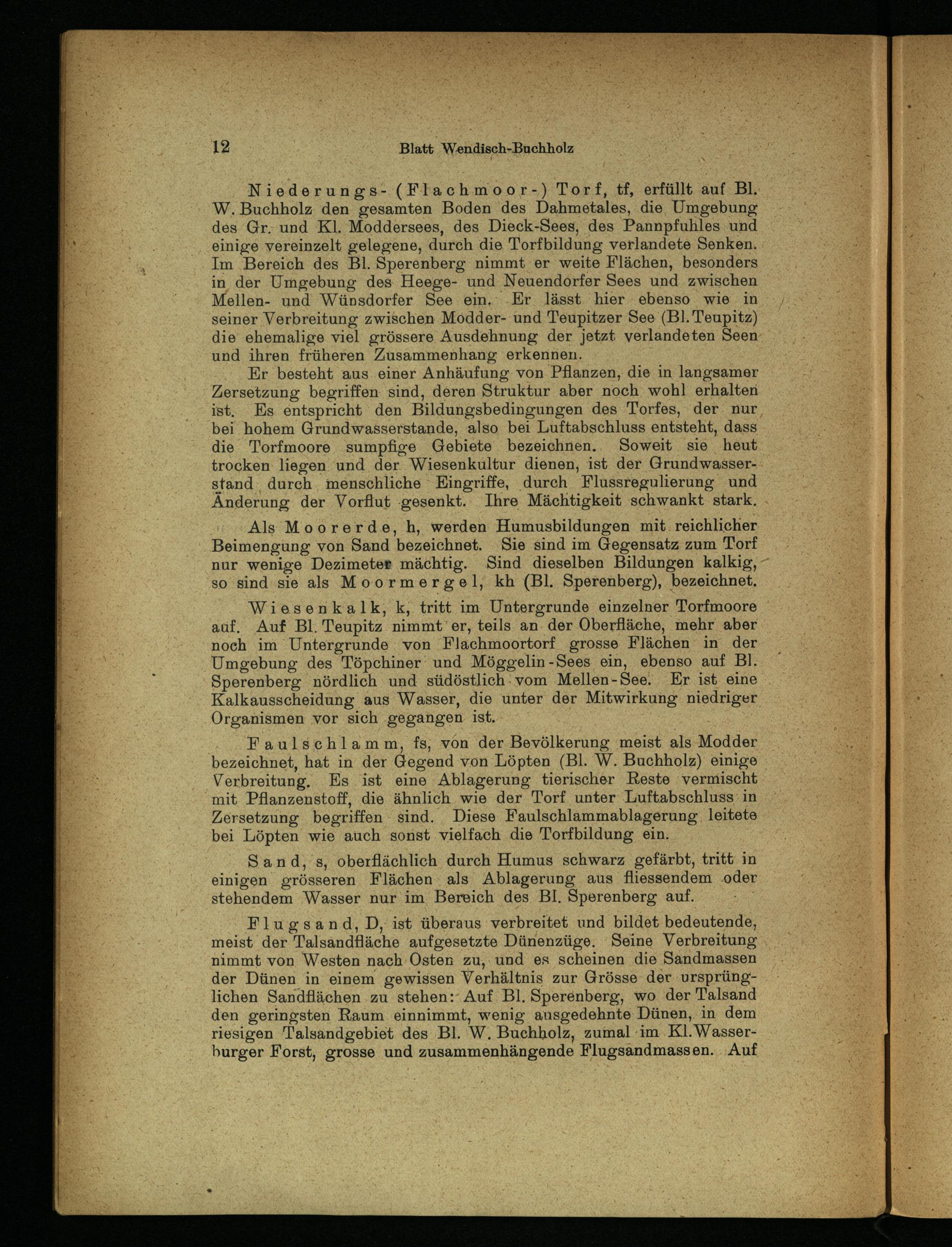 Niederungs -(Flachmoor-) Torf, tf, erfüllt auf Bl. W. Buchholz. den gesamten Boden des Dahmetales, die Umgebung des Gr -und Kl. Moddersees, des Dieck-Sees, des Pannpfuhles und einige vereinzelt gelegene, durch die Torfbildung verlandete Senken. Im Bereich des Bl. Sperenberg nimmt er weite Flächen, besonders in der Umgebung des Heege- und Neuendorfer Sees und zwischen Mellen- und Wünsdorfer See ein..Er lässt hier ebenso wie in seiner Verbreitung zwischen Modder- und Teupitzer See(Bl. Teupitz) die ehemalige viel grössere Ausdehnung der jetzt verlandeten Seen und ihren früheren Zusammenhang erkennen.