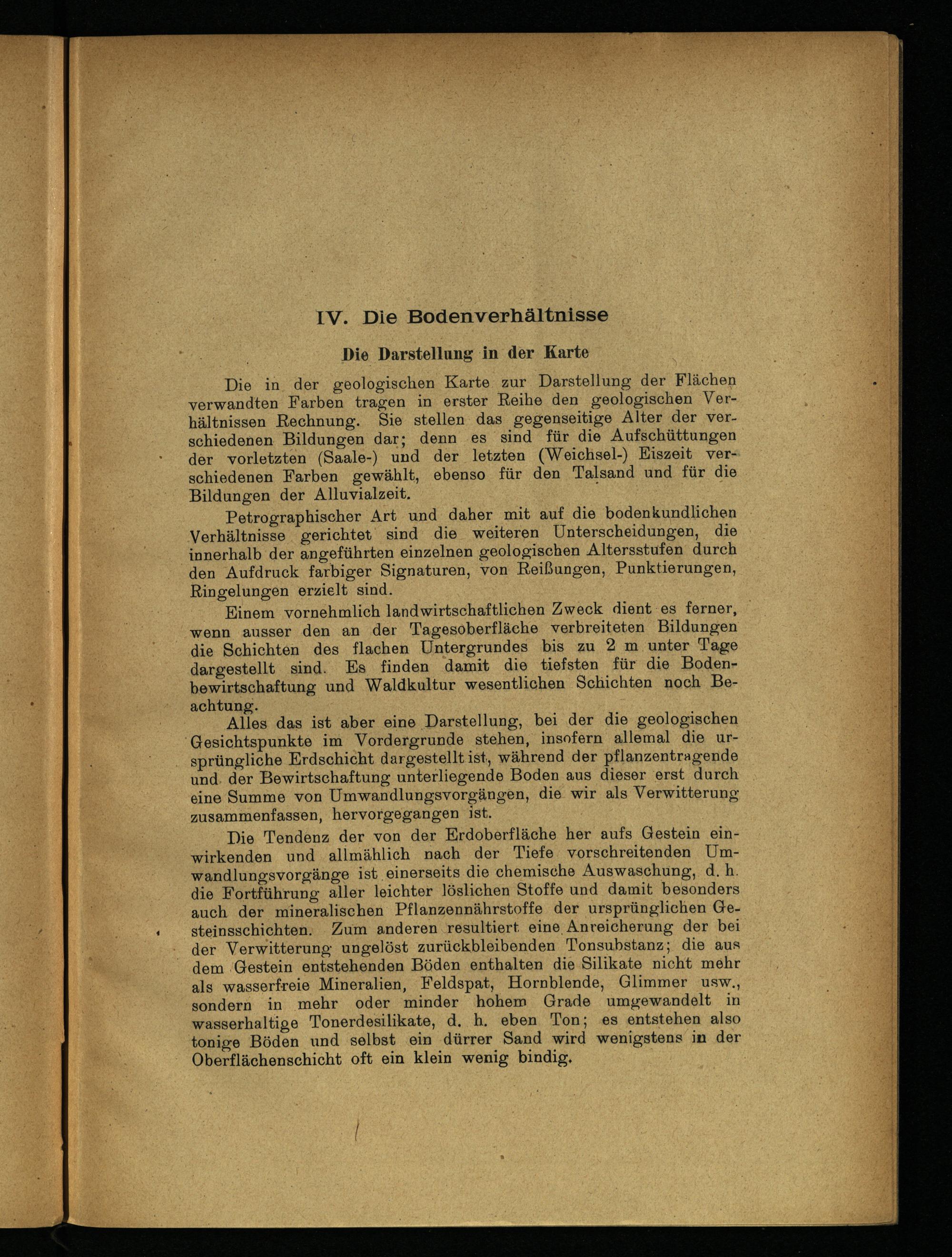 Die Tendenz der von der Erdoberfläche her aufs Gestein einwirkenden und ‚allmählich nach der Tiefe, vorschreitenden Umwandlungsvorgänge ist einerseits die chemische Auswaschung, d. h. die Fortführung aller leichter löslichen Stoffe und damit besonders auch der mineralischen Pflanzennährstoffe der ursprünglichen Gesteinsschichten. Zum anderen ‚resultiert eine Anreicherung der bei der Verwitterung ungelöst zurückbleibenden Tonsuhstanz; die aus dem ‚Gestein entstehenden Böden enthalten die Silikate nicht mehr als wasserfreie Mineralien, Feldspat, Hornblende, Glimmer usw., sondern in mehr oder minder hohem Grade umgewandelt in wasserhaltige Tonerdesilikate, d. h. eben Ton; es entstehen also tonige Böden und selbst ein dürrer Sand wird wenigstens in der Oberflächenschicht oft ein klein wenig bindig,: