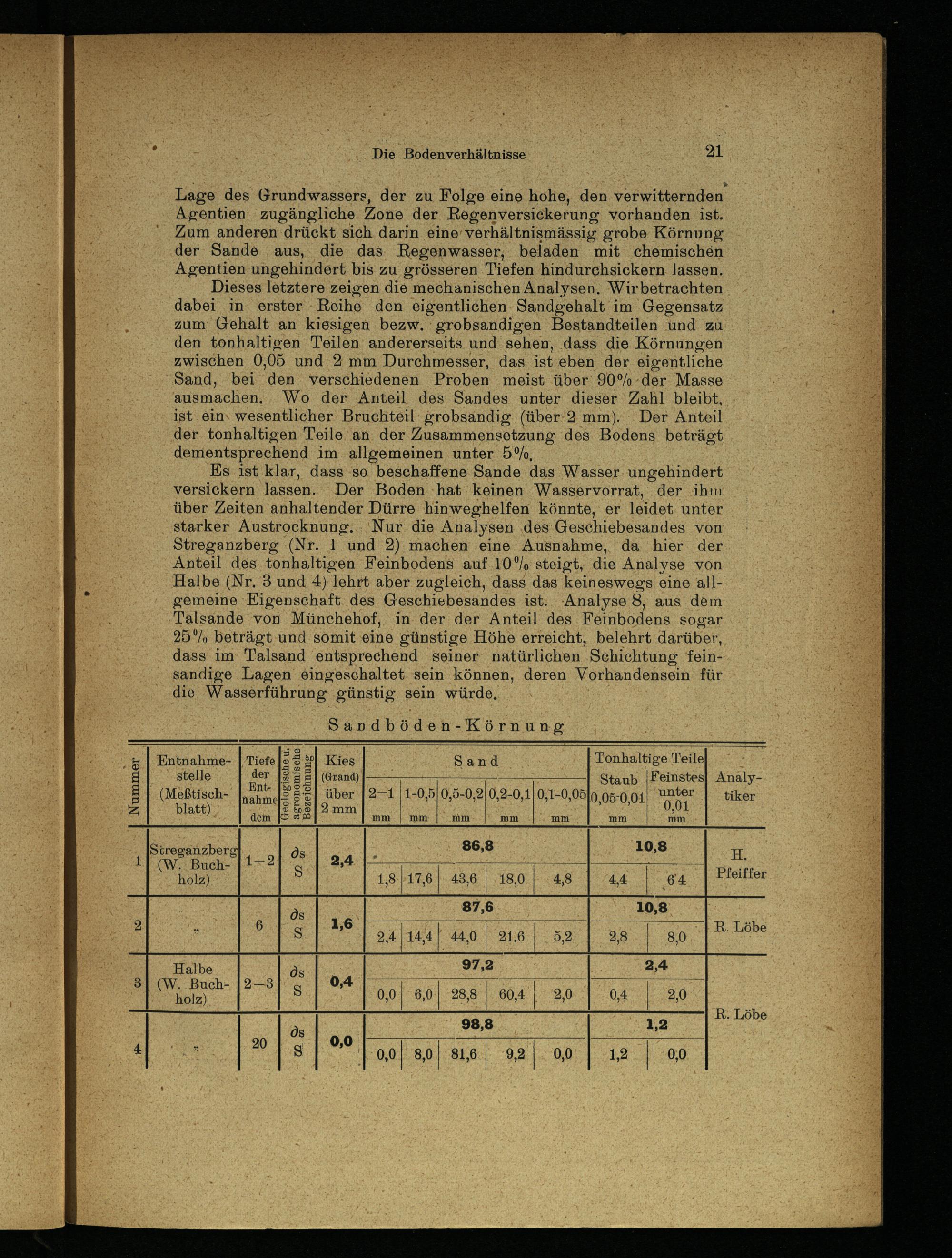 Es ist'klar, dass so. beschaffene Sande das Wasser ungehindert versickern lassen. Der Boden hat keinen Wasservorrat, der ihm über Zeiten anhaltender Dürre hinweghelfen könnte, er leidet unter starker Austrocknung... Nur. die Analysen ‚des Geschiebesandes von Streganzberg(Nr. 1 und 2) machen‘ eine Ausnahme, da hier der Anteil des tonhaltigen Feinbodens auf 10° steigt, die Analyse von Halbe(Nr. 3 und 4) lehrt aber zugleich, dass das keineswegs eine allgemeine Kigenschaft des Geschiebesandes ist: Analyse 8, aus dem ‚Talsande von Münchehof, in der der Anteil des Feinbodens sogar 25% beträgt und somit eine günstige Höhe erreicht, belehrt darüber, dass im Talsand entsprechend seiner natürlichen Schichtung feinsandige Lagen eingeschaltet sein können, deren Vorhandensein für die Wasserführung‘ günstig sein würde,