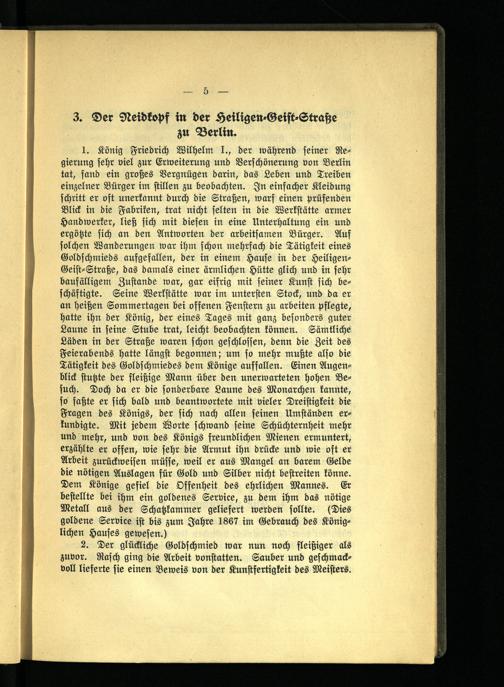 1. König Friedrich Wilhelm I., der während seiner Regierung sehr viel zur Erweiterung und Verschönerung von Berlin tat, fand ein großes Vergnügen darin, das Leben und Treiben einzelner Bürger im stillen zu beobachten. In einfacher Kleidung schritt er oft unerkannt durch die Straßen, warf einen prüfenden Blick in die Fabriken, trat nicht selten in die Werkstätte armer Handwerker, ließ sich mit diesen in eine Unterhaltung ein und ergötzte sich an den Antworten der arbeitsamen Bürger. Auf solchen Wanderungen war ihm schon mehrfach die Tätigkeit eines Goldschmieds ausgefallen, der in einem Hause in der Heiligen- Geist-Straße, das damals einer ärmlichen Hütte glich und in sehr baufälligem Zustande war, gar eifrig mit seiner Kunst sich beschäftigte. Seine Werlstätte war im untersten Stock, und da er an heißen Sommertagen bei offenen Fenstern zu arbeiten pflegte, hatte ihn der König, der eines Tages mit ganz besonders guter Laune in seine Stube trat, leicht beobachten können. Sämtliche Läden in der Straße waren schon geschlossen, denn die Zeit des Feierabends hatte längst begonnen; um so mehr mußte also die Tätigkeit des Goldschmiedes dem Könige auffallen. Einen Augenblick stutzte der fleißige Mann über den unerwarteten hohen Besuch. Doch da er die sonderbare Laune des Monarchen kannte, so faßte er sich bald und beantwortete mit vieler Dreistigkeit die Fragen des Königs, der sich nach allen seinen Umständen erkundigte. Mit jedem Worte schwand seine Schüchternheit mehr und mehr, und von des Königs freundlichen Mienen ermuntert, erzählte er offen, wie sehr die Armut ihn drücke und wie oft er Arbeit zurückweisen müsse, weil er aus Mangel an barem Gelde die nötigen Auslagen für Gold und Silber nicht bestreiten könne. Dem Könige gefiel die Offenheit des ehrlichen Mannes. Er bestellte bei ihm ein goldenes Service, zu dem ihm das nötige Metall aus der Schatzkammer geliefert werden sollte. (Dies goldene Service ist bis zum Jahre 1867 im Gebrauch des Königlichen Hauses gewesen.)