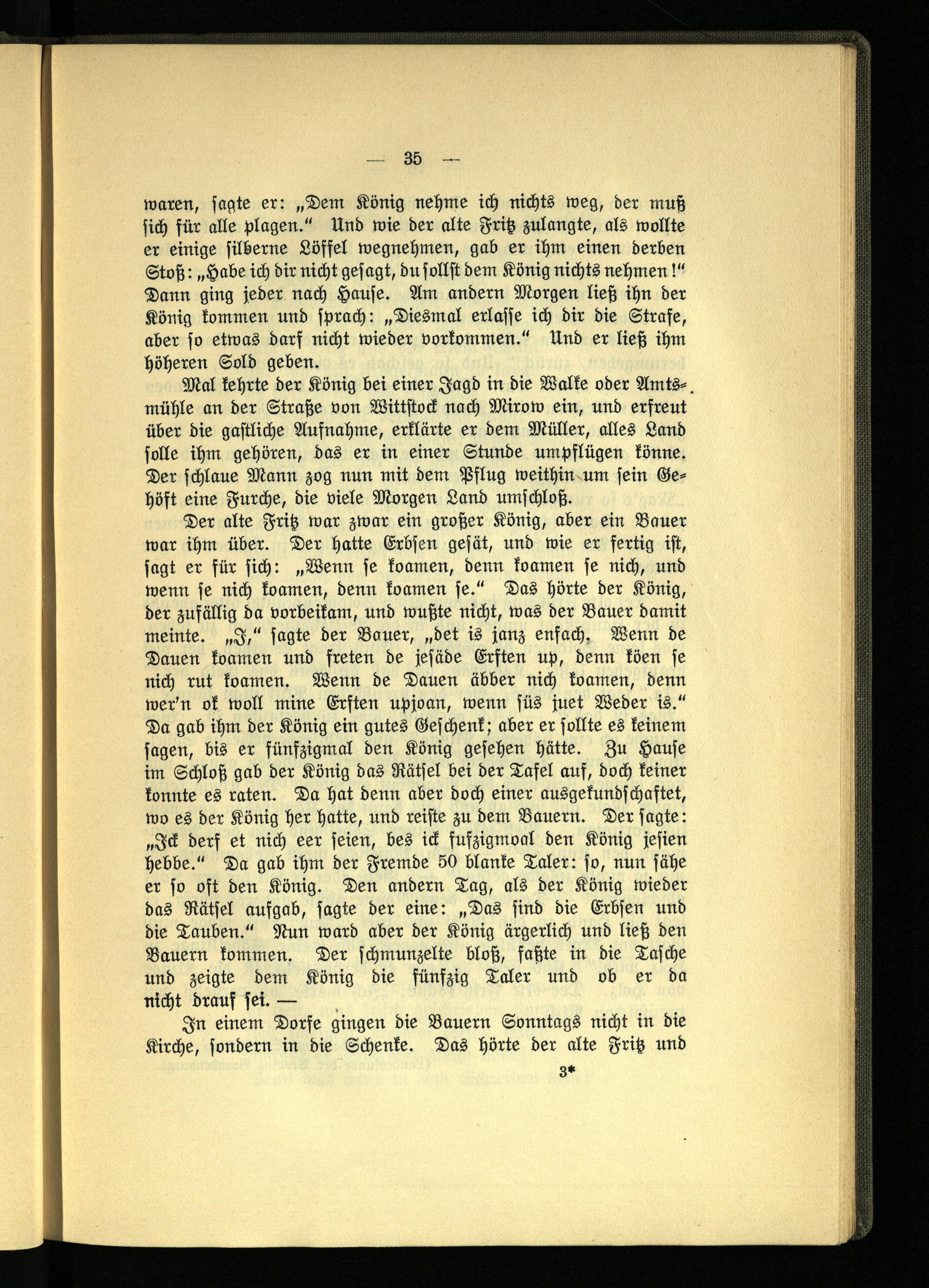 Der alte Fritz war zwar ein großer König, aber ein Bauer war ihm über. Der hatte Erbsen gesät, und wie er fertig ist, sagt er für sich: „Wenn se koamen, denn koamen se nich, und wenn se nich koamen, denn koamen se." Das hörte der König, der zufällig da vorbeikam, und wußte nicht, was der Bauer damit meinte. „I," sagte der Bauer, „det is janz enfach. Wenn de Dauen koamen und freien de jesäde Ersten up, denn köen se nich rut koamen. Wenn de Dauen äbber nich koamen, denn wer'n ok woll mine Ersten upjoan, wenn süs juet Weder is." Da gab ihm der König ein gutes Geschenk; aber er sollte es keinem sagen, bis er fünfzigmal den König gesehen hätte. Zu Hause im Schloß gab der König das Rätsel bei der Tafel auf, doch keiner konnte es raten. Da hat denn aber doch einer ausgekundschaftet, wo es der König her hatte, und reiste zu dem Bauern. Der sagte: „Ick derf et nich eer seien, bes ick fufzigmoal den König jesien hebbe." Da gab ihm der Fremde 60 blanke Taler: so, nun sähe er so oft den König. Den andern Tag, als der König wieder das Rätsel aufgab, sagte der eine: „Das sind die Erbsen und die Tauben." Nun ward aber der König ärgerlich und ließ den Bauern kommen. Der schmunzelte bloß, faßte in die Tasche und zeigte dem König die fünfzig Taler und ob er da nicht drauf sei. —
