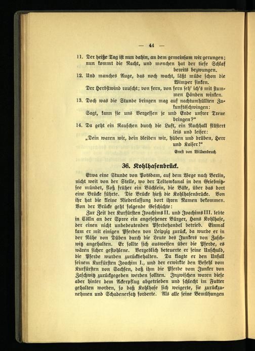 Etwa eine Stunde von Potsdam, auf dem Wege nach Berlin, nicht weit von der Stelle, wo der Teltowkanal in den Griebnitz- see mündet, floß früher ein Bächlein, die Bäke, über das dort eine Brücke führte. Die Brücke hieß die Kohlhasenbrücke. Von ihr hat die kleine Niederlassung dort ihren Namen bekommen. Von der Brücke geht folgende Geschichte:
