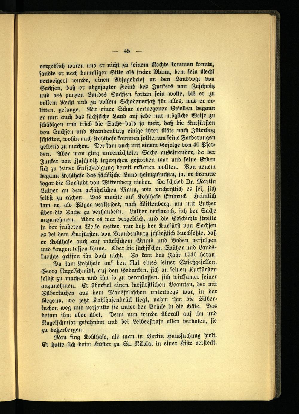 vergeblich waren und er nicht zu seinem Rechte kommen konnte, sandte er nach damaliger Sitte als freier Mann, dem sein Recht verweigert wurde, einen Absagebrief an den Landvogt von Sachsen, daß er abgesagter Feind des Junkers von Zaschwitz und des ganzen Landes Sachsen fortan sein wolle, bis er zu vollem Recht und zu vollem Schadenersatz für alles, was er erlitten, gelange. Mit einer Schar verwegener Gesellen begann er nun auch das sächsische Land auf jede nur mögliche Weise zu schädigen und trieb die Sache bald so weit, daß die Kurfürsten von Sachsen und Brandenburg einige ihrer Räte nach Jüterbog schickten, wohin auch Kohlhase kommen sollte, um seine Forderungen geltend zu machen. Der kam auch mit einem Gefolge von 40 Pferden. Aber man ging unverrichteter Sache auseinander, da der Junker von Zaschwitz inzwischen gestorben war und seine Erben sich zu keiner Entschädigung bereit erklären wollten. Von neuem begann Kohlhase das sächsische Land heimzusuchen, ja, er brannte sogar die Vorstadt von Wittenberg nieder. Da schrieb vr. Martin Luther an den gefährlichen Mann, wie unchristlich es sei, sich selbst zu rächen. Das machte auf Kohlhase Eindruck. Heimlich kam er, als Pilger verkleidet, nach Wittenberg, um mit Luther über die Sache zu verhandeln. Luther versprach, sich der Sache anzunehmen. Aber es war vergeblich, und die Geschichte spielte in der früheren Weise weiter, nur daß der Kurfürst von Sachsen es bei dem Kurfürsten von Brandenburg schließlich durchsetzte, daß er Kohlhase auch auf märkischem Grund und Boden verfolgen und fangen lassen könne. Aber die sächsischen Späher und Landsknechte griffen ihn doch nicht. So kam das Jahr 1840 heran.