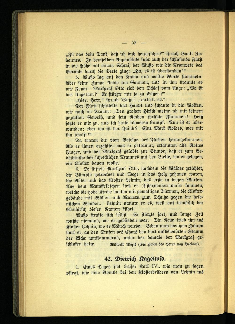 6. So stiftete Markgraf Otto, nachdem die Wälder gelichtet, die Sümpfe getrocknet und Wege in das Holz gehauen waren, die Abtei und das Kloster Lehnin, das erste in diesen Marken. Aus dem Mansfeldschen ließ er Zisterziensermönche kommen, welche die hohe Kirche bauten mit gewaltigen Türmen, die Klostergebäude mit Wällen und Mauern zum Schutze gegen die heidnischen Wenden. Lehnin nannte er es, weil auf wendisch der Elenhirsch diesen Namen führt.