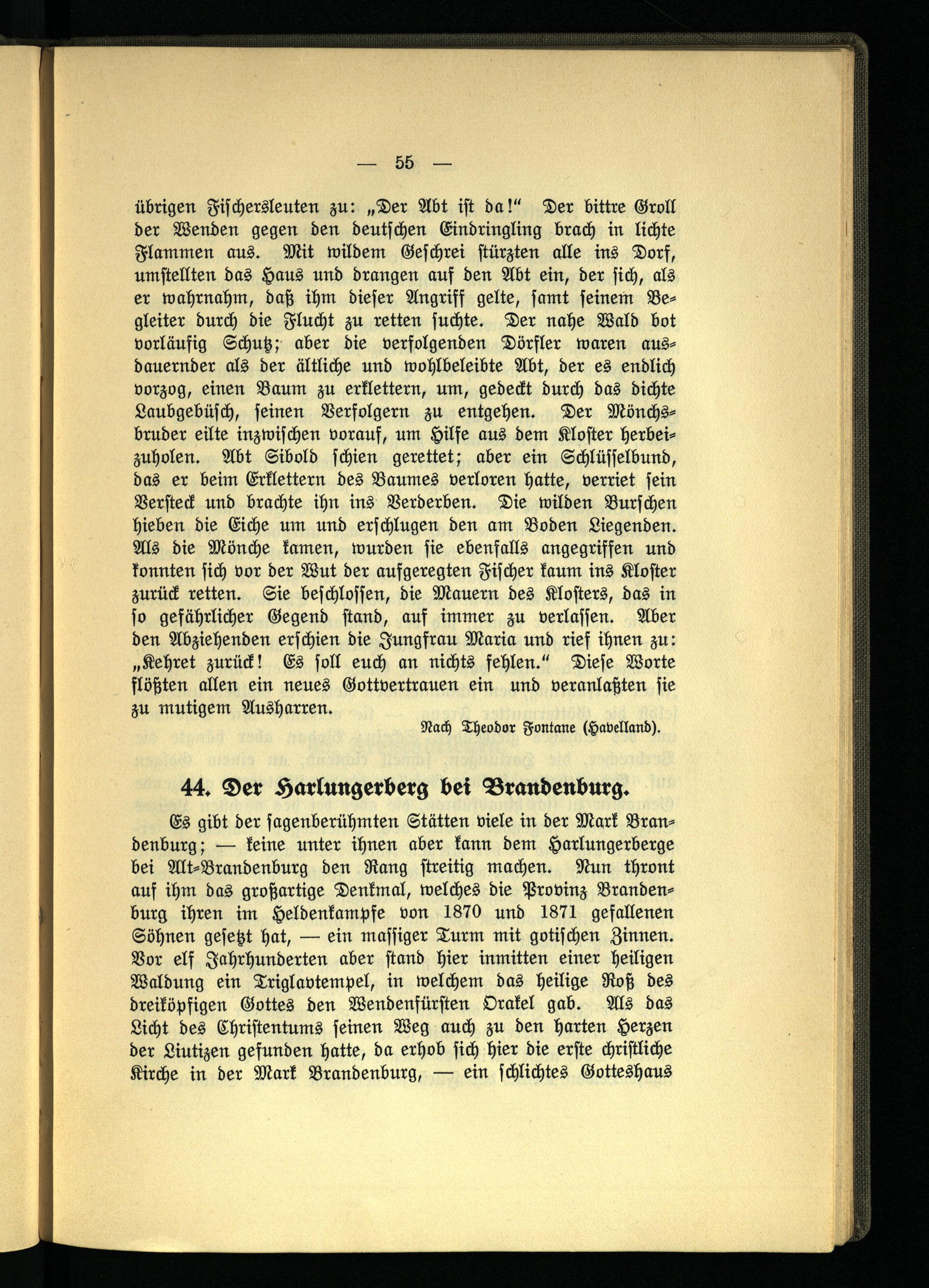 Es gibt der sagenberühmten Stätten viele in der Mark Brandenburg; — keine unter ihnen aber kann dem Harlungerberge bei Alt-Brandenburg den Rang streitig machen. Nun thront auf ihm das großartige Denkmal, welches die Provinz Brandenburg ihren im Heldenkampfe von 1870 und 1871 gefallenen Söhnen gesetzt hat, — ein massiger Turm mit gotischen Zinnen. Vor elf Jahrhunderten aber stand hier inmitten einer heiligen Waldung ein Triglavtempel, in welchem das heilige Roß des dreiköpfigen Gottes den Wendenfürsten Orakel gab. Als das Licht des Christentums seinen Weg auch zu den harten Herzen der Liutizen gefunden hatte, da erhob sich hier die erste christliche Kirche in der Mark Brandenburg, — ein schlichtes Gotteshaus