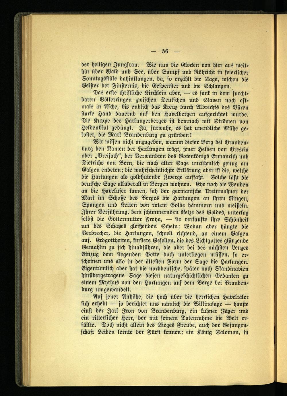 Wir wissen nicht anzugeben, warum dieser Berg bei Brandenburg den Namen der Härtungen trägt, jener Helden von Brescia oder „Breisach", der Verwandten des Gotenkönigs Ermanrich und Dietrichs von Bern, die nach alter Sage unrühmlich genug am Galgen endeten; die wahrscheinlichste Erklärung aber ist die, welche die Hartungen als goldhütende Zwerge auffaßt. Solche läßt die deutsche Sage allüberall in Bergen wohnen. Ehe noch die Wenden an die Havelufer kamen, sah der germanische Ureinwohner der Mark im Schoße des Berges die Harlungen an ihren Ringen, Spangen und Ketten von rotem Golde hämmern und meißeln. Ihrer Verführung, dem schimmernden Reize des Goldes, unterlag selbst die Göttermutter Freya, — sie verkaufte ihre Schönheit um des Schatzes gleißenden Schein; Wodan aber hängte die Verbrecher, die Harlungen, schnell richtend, an einem Galgen aus. Erdgottheiten, finstere Gesellen, die des Lichtgottes glänzende Gemahlin zu sich hinabführen, die aber bei des nächsten Lenzes Einzug dem siegenden Gotte doch unterliegen müssen, so erscheinen uns also in der ältesten Form der Sage die Harlungen. Eigentümlich aber hat die norddeutsche, später nach Skandinavien hinübergetragene Sage diesen naturgeschichtlichen Gedanken zu einem Mythus von den Harlungen auf dem Berge bei Brandenburg umgewandelt.