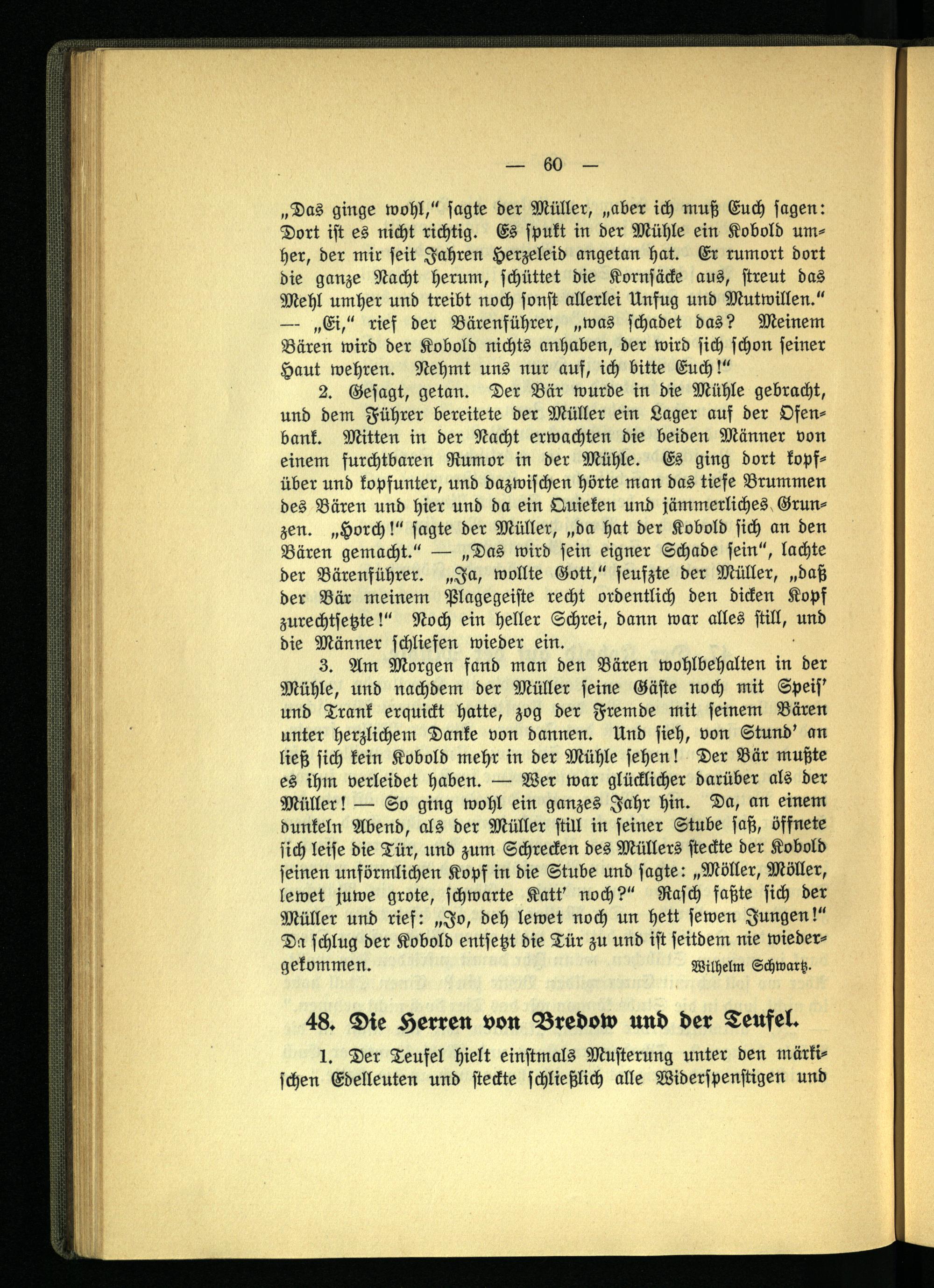 Mühle, und nachdem der Müller seine Gäste noch mit Speis' und Trank erquickt hatte, zog der Fremde mit seinem Bären unter herzlichem Danke von dannen. Und sieh, von Stund' an ließ sich kein Kobold mehr in der Mühle sehen! Der Bär mußte es ihm verleidet haben. — Wer war glücklicher darüber als der Müller! — So ging wohl ein ganzes Jahr hin. Da, an einem dunkeln Abend, als der Müller still in seiner Stube saß, öffnete sich leise die Tür, und zum Schrecken des Müllers steckte der Kobold seinen unförmlichen Kopf in die Stube und sagte: „Möller, Möller, lewet juwe grote, schwarte Katt' noch?" Rasch faßte sich der Müller und rief: „Jo, deh lewet noch un hett sewen Jungen!" Da schlug der Kobold entsetzt die Tür zu und ist seitdem nie wiedergekommen. Wilhelm Schwartz.