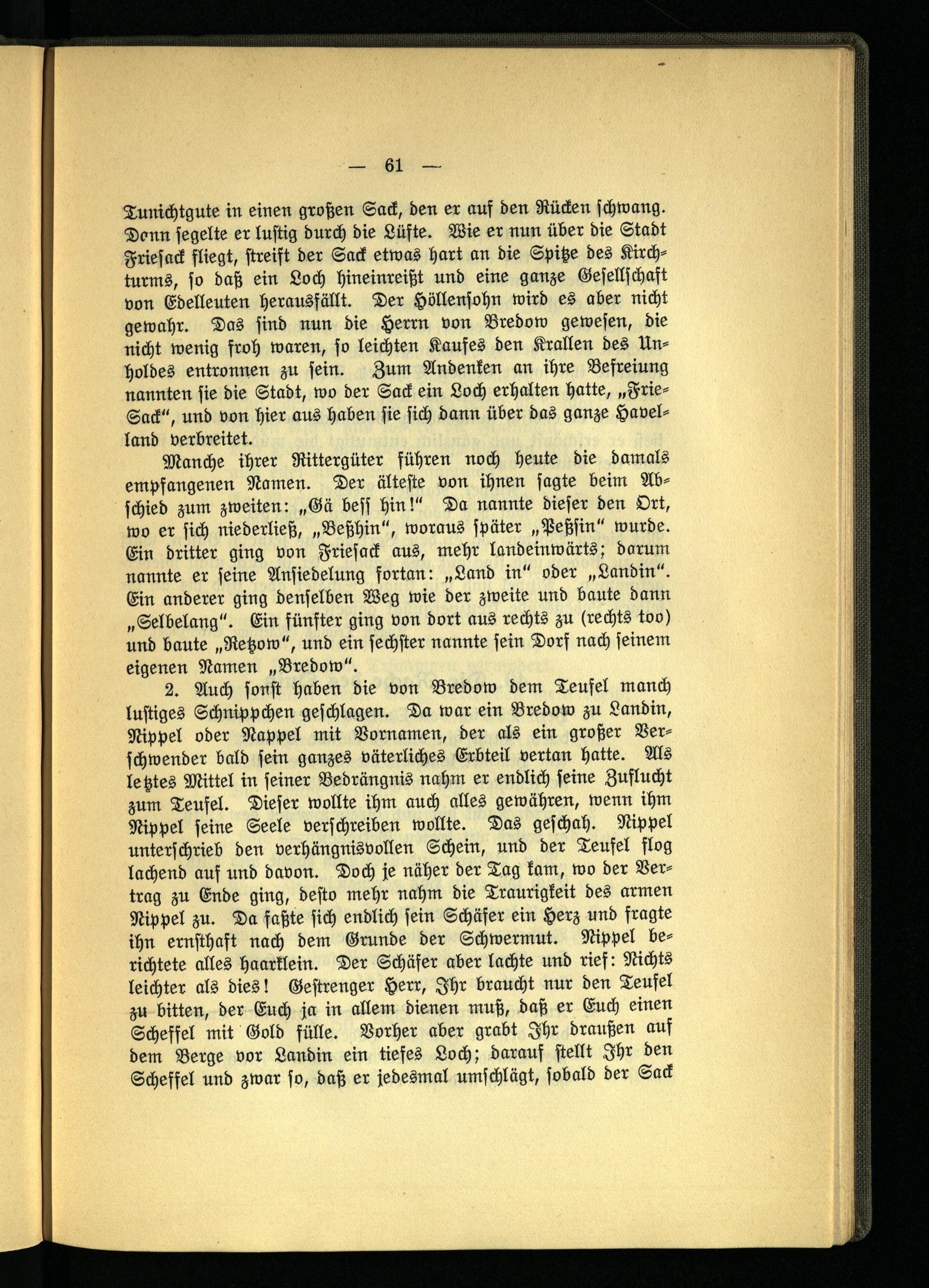 Tunichtgute in einen großen Sack, den er auf den Rücken schwang. Dann segelte er lustig durch die Lüfte. Wie er nun über die Stadt Friesack fliegt, streift der Sack etwas hart an die Spitze des Kirchturms, so daß ein Loch hineinreißt und eine ganze Gesellschaft von Edelleuten herausfällt. Der Höllensohn wird es aber nicht gewahr. Das sind nun die Herrn von Bredow gewesen, die nicht wenig froh waren, so leichten Kaufes den Krallen des Unholdes entronnen zu fein. Zum Andenken an ihre Befreiung nannten sie die Stadt, wo der Sack ein Loch erhalten hatte, „Frie- Sack", und von hier aus haben sie sich dann über das ganze Havelland verbreitet.