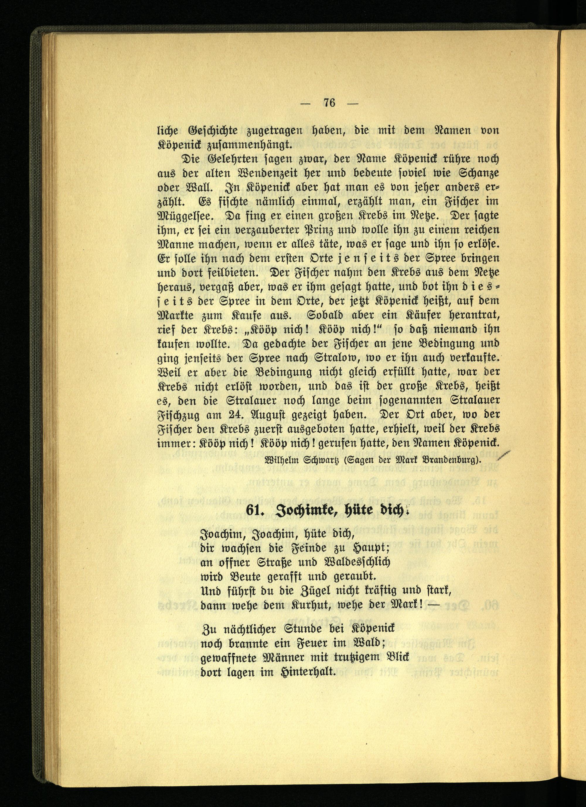 Die Gelehrten sagen zwar, der Name Köpenick rühre noch aus der alten Wendenzeit her und bedeute soviel wie Schanze oder Wall. In Köpenick aber hat man es von jeher anders erzählt. Es fischte nämlich einmal, erzählt man, ein Fischer im Müggelsee. Da fing er einen großen Krebs im Netze. Der sagte ihm, er sei ein verzauberter Prinz und wolle ihn zu einem reichen Manne machen, wenn er alles täte, was er sage und ihn so erlöse. Er solle ihn nach dem ersten Orte jenseits der Spree bringen und dort feilbieten. Der Fischer nahm den Krebs aus dem Netze heraus, vergaß aber, was er ihm gesagt hatte, und bot ihndiesse i t s der Spree in dem Orte, der jetzt Köpenick heißt, auf dem Markte zum Kaufe aus. Sobald aber ein Käufer herantrat, rief der Krebs: „Kööp nich! Kööp nich!" so daß niemand ihn kaufen wollte. Da gedachte der Fischer an jene Bedingung und ging jenseits der Spree nach Stralow, wo er ihn auch verkaufte. Weil er aber die Bedingung nicht gleich erfüllt hatte, war der Krebs nicht erlöst worden, und das ist der große Krebs, heißt es, den die Stralauer noch lange beim sogenannten Stralauer Fischzug am 24. August gezeigt haben. Der Ort aber, wo der Fischer den Krebs zuerst ausgeboten hatte, erhielt, weil der Krebs immer: Kööp nich! Kööp nich! gerufen hatte, den Namen Köpenick.
