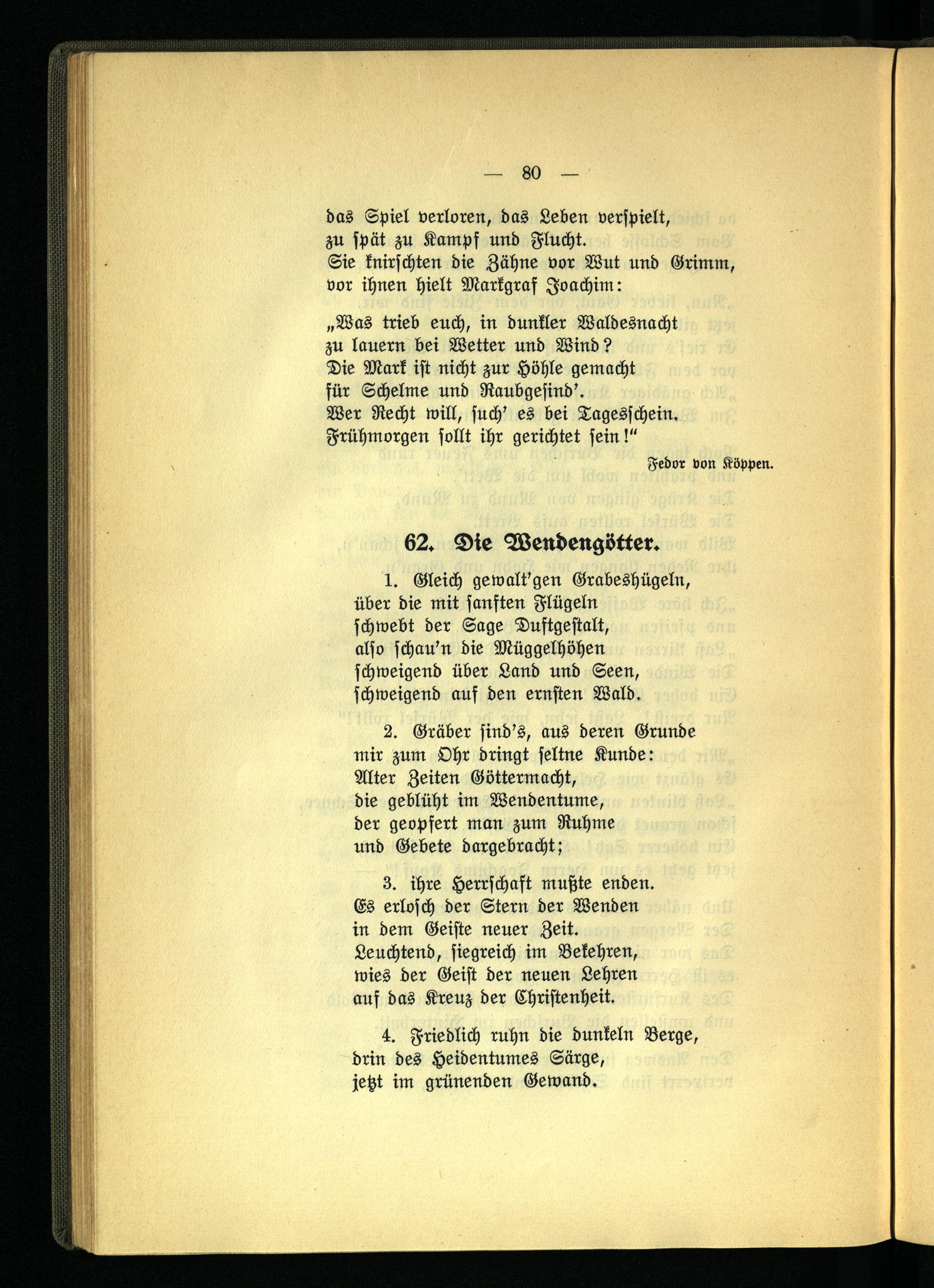 schwebt der Sage Duftgestalt, also schau'u die Müggelhöhen schweigend über Land und Seen, schweigend auf den ernsten Wald.