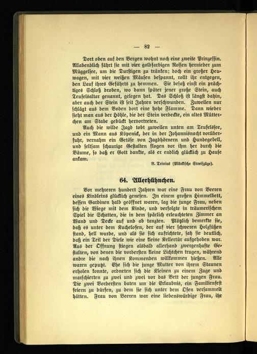 Vor mehreren hundert Jahren war eine Frau von Beeren eines Kindleins glücklich genesen. In einem großen Himmelbett, dessen Gardinen halb geöffnet waren, lag die junge Frau, neben sich die Wiege mit dem Kinde, und verfolgte in träumerischem Spiel die Schatten, die in dem spärlich erleuchteten Zimmer an Wand und Decke auf und ab tanzten. Plötzlich bemerkte sie, daß es unter dem Kachelofen, der auf vier schweren Holzfüßen stand, hell wurde, und als sie sich aufrichtete, sah sie deutlich, daß ein Teil der Diele wie eine kleine Kellertür aufgehoben war. Aus der Öffnung stiegen alsbald allerhand zwergenhafte Gestalten, von denen die vordersten kleine Lichtchen trugen, während andre die nach ihnen Kommenden willkommen hießen. Alle waren geputzt. Ehe sich die junge Mutter von ihrem Staunen erholen konnte, ordneten sich die Kleinen zu einem Zuge und marschierten zu zwei und zwei vor das Bett der jungen Frau. Die zwei Vordersten baten um die Erlaubnis, ein Familienfest feiern zu dürfen, zu dem sie sich unter dem Ofen versammelt hätten. Frau von Beeren war eine liebenswürdige Frau, ihr