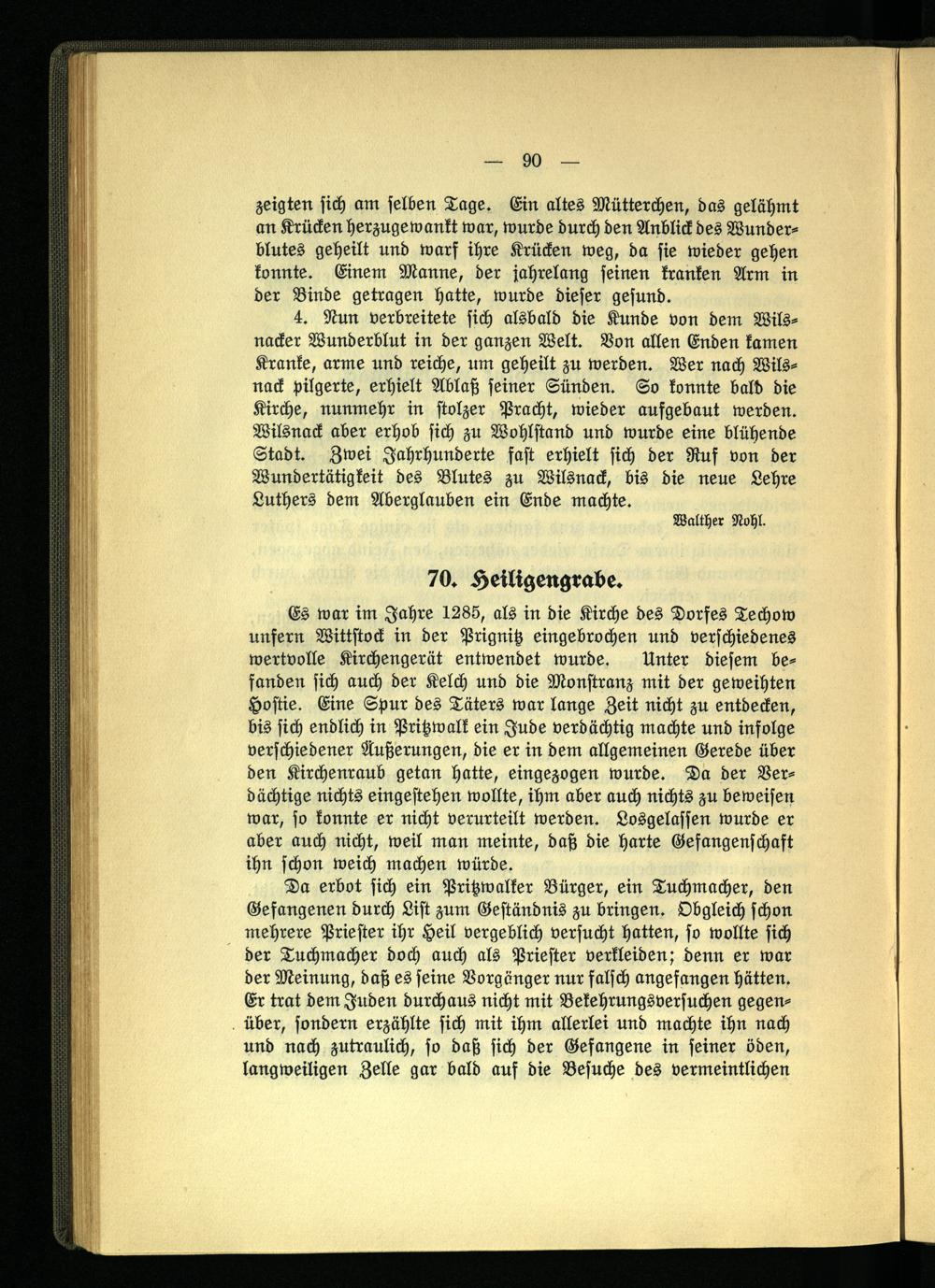 4. Nun verbreitete sich alsbald die Kunde von dem Wils- nacker Wunderblut in der ganzen Welt. Von allen Enden kamen Kranke, arme und reiche, um geheilt zu werden. Wer nach Wilsnack pilgerte, erhielt Ablaß seiner Sünden. So konnte bald die Kirche, nunmehr in stolzer Pracht, wieder aufgebaut werden. Wilsnack aber erhob sich zu Wohlstand und wurde eine blühende Stadt. Zwei Jahrhunderte fast erhielt sich der Ruf von der Wundertätigkeit des Blutes zu Wilsnack, bis die neue Lehre Luthers dem Aberglauben ein Ende machte.