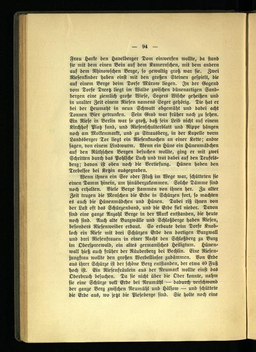 Frau Harke den Havelberger Dom einwerfen wollte, da stand sie mit dem einen Bein auf dem Kamernschen, mit dem andern auf dem Rhinowschen Berge, fo gewaltig groß war sie. Zwei Riesenkinder haben einst mit den großen Steinen gespielt, die auf einem Berge beim Dorfe Mürow liegen. In der Gegend vom Dorfe Dreetz liegt im Walde zwischen dünenartigen Sandbergen eine ziemlich große Wiese, Segers Wische geheißen und in uralter Zeit einem Riesen namens Seger gehörig. Die hat er bei der Heumaht in neun Schwatt abgemäht und dabei acht Tonnen Bier getrunken. Sein Grab war früher noch zu sehen. Ein Riese in Berlin war so groß, daß sein Leib nicht auf einem Kirchhof Platz fand, und Riesenschulterblatt und Rippe hängen noch am Molkenmarkt, und zu Strausberg, in der Kapelle vorm Landsberger Tor liegt ein Riesenknochen an einer Kette; andre sagen, von einem Lindwurm. Wenn ein Hüne ein Hünenmädchen auf den Rüthschen Bergen besuchen wollte, ging er mit zwei Schritten durch das Pohlsche Luch und trat dabei auf den Teufelsberg; davon ist oben noch die Vertiefung. Hünen haben den Trebelsee bei Ketzin ausgegraben.