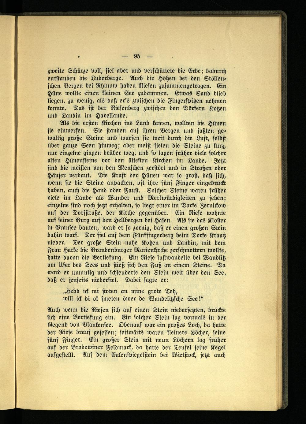 Als die ersten Kirchen ins Land kamen, wollten die Hünen sie einwerfen. Sie standen auf ihren Bergen und faßten gewaltig große Steine und warfen sie weit durch die Luft, selbst über ganze Seen hinweg; aber meist fielen die Steine zu kurz, nur einzelne gingen drüber weg, und so lagen früher viele solcher alten Hünensteine vor den ältesten Kirchen im Lande. Jetzt sind die meisten von den Menschen zerstört und in Straßen oder Häuser verbaut. Die Kraft der Hünen war so groß, daß sich, wenn sie die Steine anpackten, oft ihre fünf Finger eingedrückt haben, auch die Hand oder Faust. Solcher Steine waren früher viele im Lande als Wunder und Merkwürdigkeiten zu sehen; einzelne sind noch jetzt erhalten, so liegt einer im Dorfe Zernickow auf der Dorfstraße, der Kirche gegenüber. Ein Riese wohnte auf seiner Burg auf den Hellbergen bei Häsen. Als sie das Kloster in Gransee bauten, ward er so zornig, daß er einen großen Stein dahin warf. Der fiel auf dem Fünffingerberg beim Dorfe Kraatz nieder. Der große Stein nahe Kotzen und Landin, mit dem Frau Harke die Brandenburger Marienkirche zerschmettern wollte, hatte davon die Vertiefung. Ein Riese lustwandelte bei Wandlitz am Ufer des Sees und stieß sich den Fuß an einem Steine. Da ward er unmutig und schleuderte den Stein weit über den See, daß er jenseits niederfiel. Dabei sagte er: