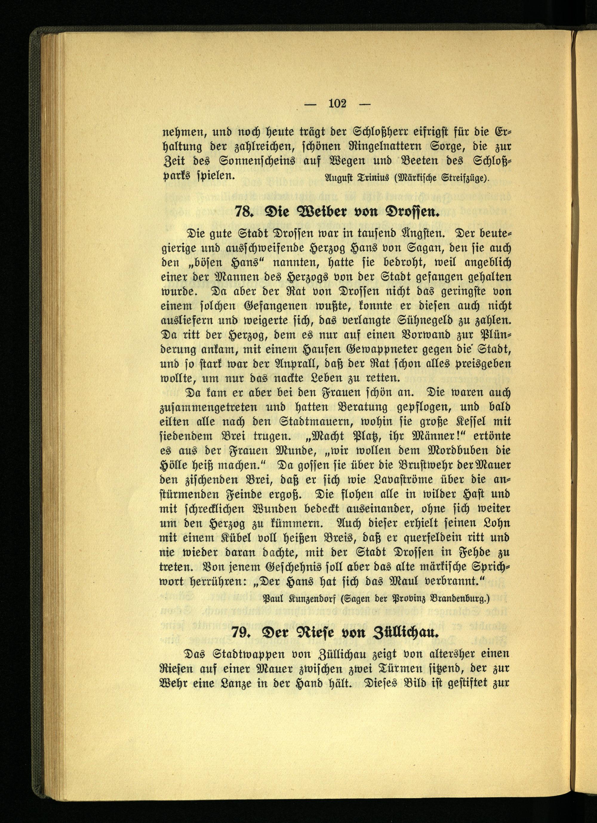 Da kam er aber bei den Frauen schön an. Die waren auch zusammengetreten und hatten Beratung gepflogen, und bald eilten alle nach den Stadtmauern, wohin sie große Kessel mit siedendem Brei trugen. „Macht Platz, ihr Männer!" ertönte es aus der Frauen Munde, „wir wollen dem Mordbuben die Hölle heiß machen." Da gossen sie über die Brustwehr derMauer den zischenden Brei, daß er sich wie Lavaströme über die anstürmenden Feinde ergoß. Die flohen alle in wilder Hast und mit schrecklichen Wunden bedeckt auseinander, ohne sich weiter um den Herzog zu kümmern. Auch dieser erhielt seinen Lohn mit einem Kübel voll heißen Breis, daß er querfeldein ritt und nie wieder daran dachte, mit der Stadt Drossen in Fehde zu treten. Von jenem Geschehnis soll aber das alte märkische Sprichwort herrühren: „Der Hans hat sich das Maul verbrannt."
