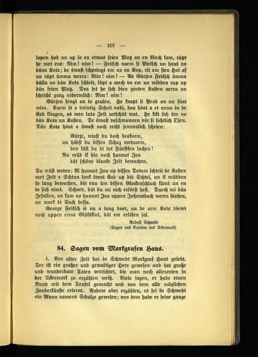 1. Vor alter Zeit hat in Schwedt Markgraf Hans gelebt. Der ist ein großer und gewaltiger Herr gewesen und hat große und wunderbare Taten verrichtet, die man noch allerorten in der Uckermark zu erzählen weiß. Viele sagen, er habe einen Bund mit dem Teufel gemacht und von dem alle möglichen Zauberkünste erlernt. Andere aber erzählen, es sei in Schwedt ein Mann namens Schulze gewesen; von dem habe er seine ganze