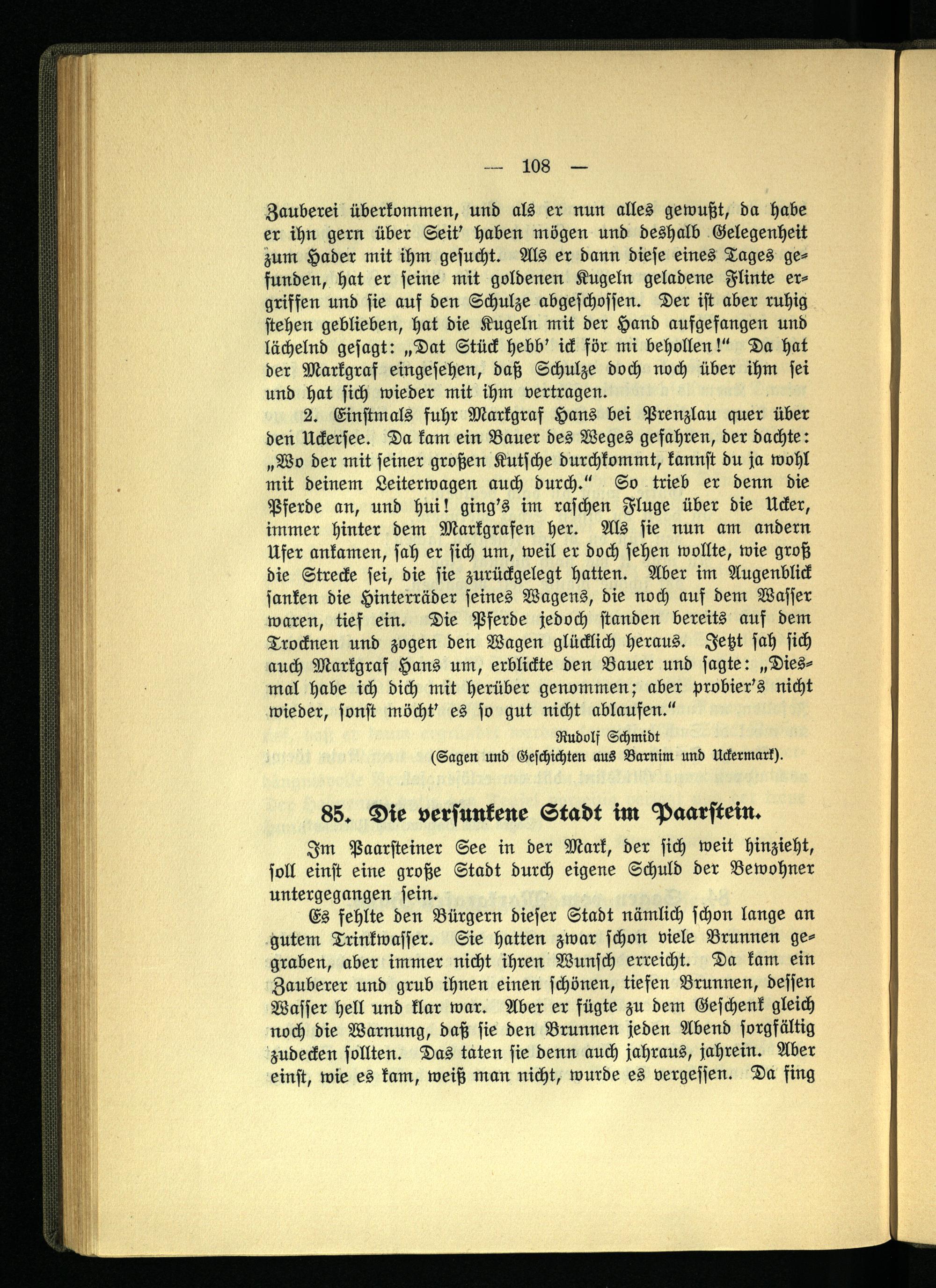 2. Einstmals fuhr Markgraf Hans bei Prenzlau quer über den Uckersee. Da kam ein Bauer des Weges gefahren, der dachte: „Wo der mit seiner großen Kutsche durchkommt, kannst du ja wohl mit deinem Leiterwagen auch durch." So trieb er denn die Pferde an, und hui! ging's im raschen Fluge über die Ucker, immer hinter dem Markgrafen her. Als sie nun am andern Ufer ankamen, sah er sich um, weil er doch sehen wollte, wie groß die Strecke sei, die sie zurückgelegt hatten. Aber im Augenblick sanken die Hinterräder seines Wagens, die noch auf dem Wasser waren, tief ein. Die Pferde jedoch standen bereits auf dem Trocknen und zogen den Wagen glücklich heraus. Jetzt sah sich auch Markgraf Hans um, erblickte den Bauer und sagte: „Diesmal habe ich dich mit herüber genommen; aber probier's nicht wieder, sonst möcht' es so gut nicht ablaufen."