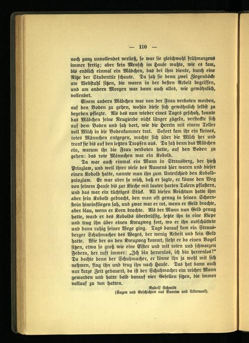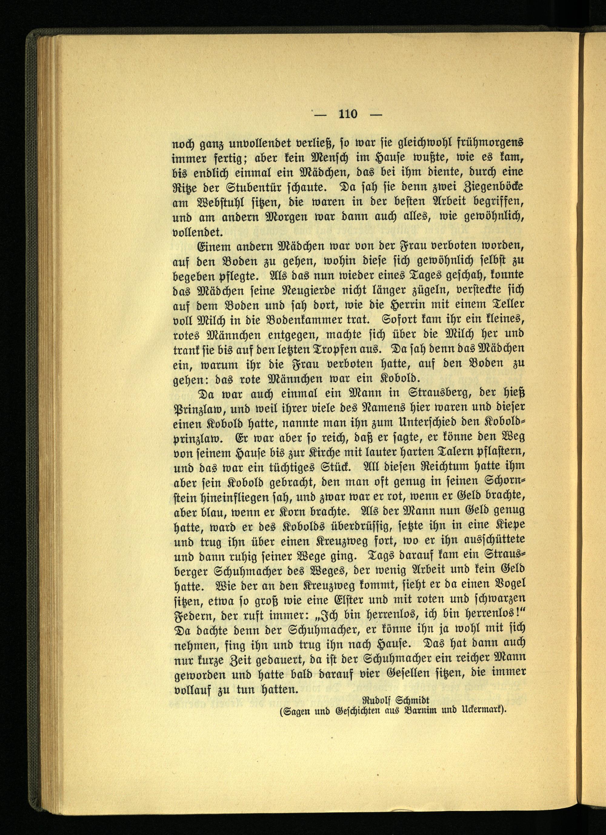 Da war auch einmal ein Mann in Strausberg, der hieß Prinzlaw, und weil ihrer viele des Namens hier waren und dieser einen Kobold hatte, nannte man ihn zum Unterschied den Kobold- prinzlaw. Er war aber so reich, daß er sagte, er könne den Weg von seinem Hause bis zur Kirche mit lauter harten Talern pflastern, und das war ein tüchtiges Stück. All diesen Reichtum hatte ihm aber sein Kobold gebracht, den man oft genug in feinen Schornstein hineinfliegen sah, und zwar war er rot, wenn er Geld brachte, aber blau, wenn er Korn brachte. Als der Mann nun Geld genug hatte, ward er des Kobolds überdrüssig, setzte ihn in eine Kiepe und trug ihn über einen Kreuzweg fort, wo er ihn ausschüttete und dann ruhig seiner Wege ging. Tags darauf kam ein Strausberger Schuhmacher des Weges, der wenig Arbeit und kein Geld hatte. Wie der an den Kreuzweg kommt, sieht er da einen Vogel sitzen, etwa so groß wie eine Elster und mit roten und schwarzen Federn, der ruft immer: „Ich bin herrenlos, ich bin herrenlos!" Da dachte denn der Schuhmacher, er könne ihn ja wohl mit sich nehmen, fing ihn und trug ihn nach Hause. Das hat dann auch nur kurze Zeit gedauert, da ist der Schuhmacher ein reicher Mann geworden und hatte bald darauf vier Gesellen sitzen, die immer vollauf zu tun hatten.