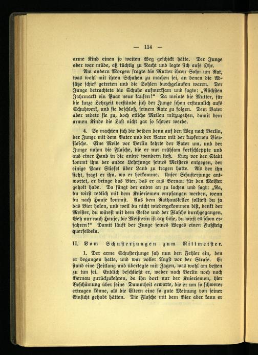 1. Der arme Schusterjunge sah nun den Fehler ein, den er begangen hatte, und war voller Angst vor der Strafe. Er stand eine Zeitlang und überlegte mit Zagen, was wohl am besten zu tun sei. Endlich beschließt er, weder nach Berlin noch nach Bernau zurückzukehren, da ihn dort nur der Knieriemen, hier Beschämung über seine Dummheit erwarte, die er um so schwerer ertragen könne, als die Eltern eine so gute Meinung von seiner Einsicht gehabt hätten. Die Flasche mit dem Bier aber kann er
