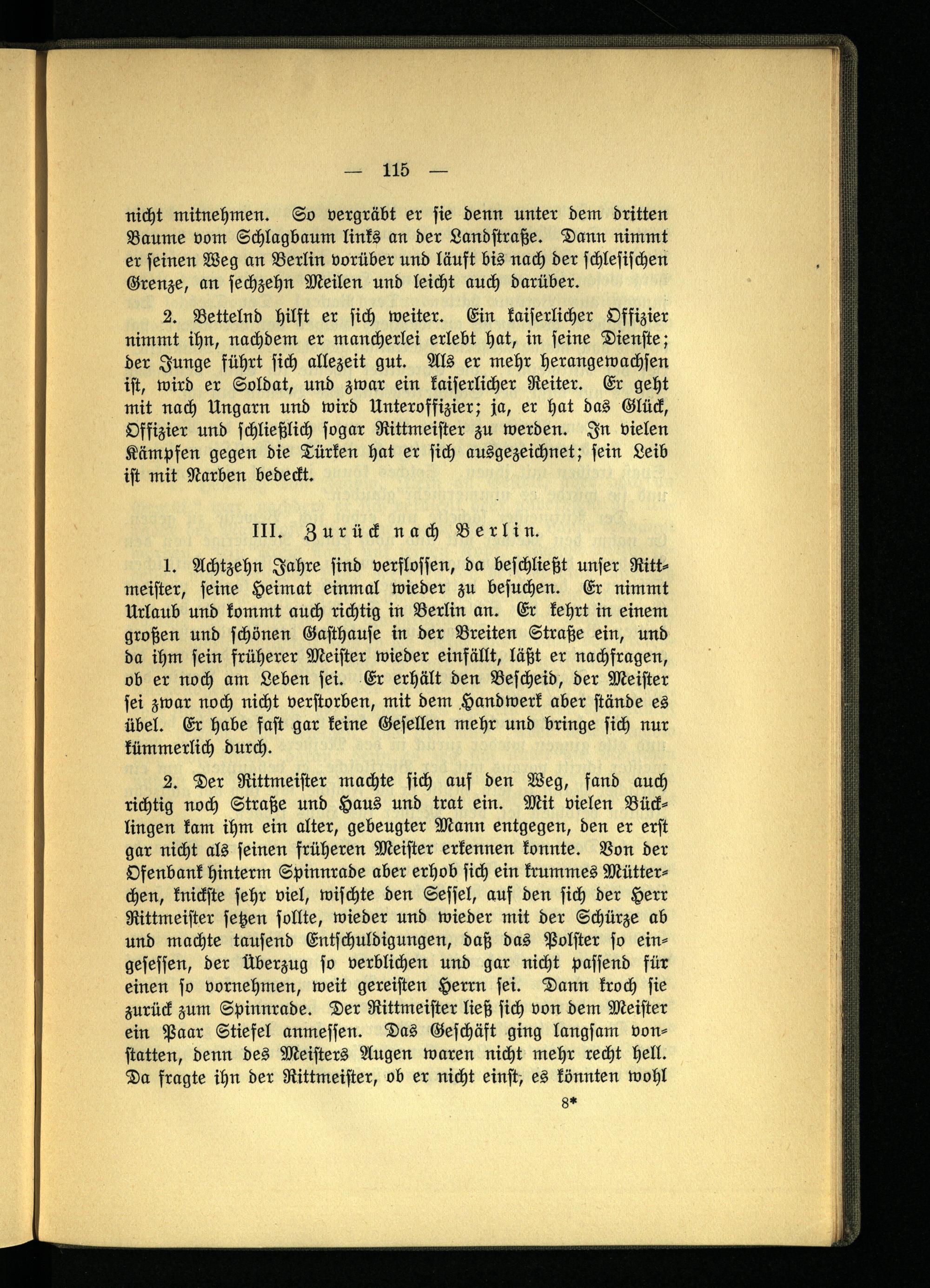 1. Achtzehn Jahre sind verflossen, da beschließt unser Rittmeister, seine Heimat einmal wieder zu besuchen. Er nimmt Urlaub und kommt auch richtig in Berlin an. Er kehrt in einem großen und schönen Gasthause in der Breiten Straße ein, und da ihm sein früherer Meister wieder einfällt, läßt er Nachfragen, ob er noch am Leben sei. Er erhält den Bescheid, der Meister sei zwar noch nicht verstorben, mit dem Handwerk aber stände es übel. Er habe fast gar keine Gesellen mehr und bringe sich nur kümmerlich durch.