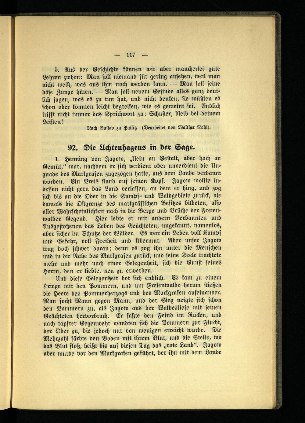 Und diese Gelegenheit bot sich endlich. Es kam zu einem Kriege mit den Pommern, und um Freienwalde herum stießen die Heere des Pommerherzogs und des Markgrafen aufeinander. Man focht Mann gegen Mann, und der Sieg neigte sich schon den Pommern zu, als Jagow aus der Waldestiefe mit seinen Geächteten hervorbrach. Er faßte den Feind im Rücken, und nach tapfrer Gegenwehr wandten sich die Pommern zur Flucht, der Oder zu, die jedoch nur von wenigen erreicht wurde. Die Mehrzahl färbte den Boden mit ihrem Blut, und die Stelle, wo das Blut floß, heißt bis auf diesen Tag das „rote Land". Jagow aber wurde vor den Markgrafen geführt, der ihn mit dem Lande