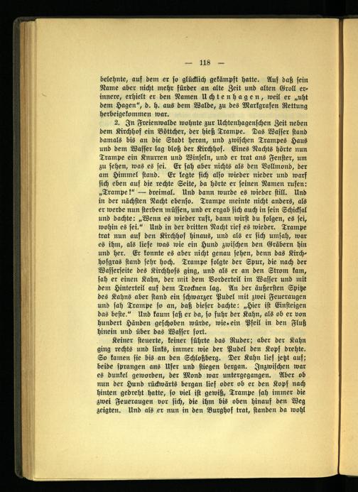 2. In Freienwalde wohnte zur Uchtenhagenschen Zeit neben dem Kirchhof ein Böttcher, der hieß Trampe. Das Wasser stand damals bis an die Stadt heran, und zwischen Trampes Haus und dem Wasser lag bloß der Kirchhof. Eines Nachts hörte nun Trampe ein Knurren und Winseln, und er trat ans Fenster, um zu sehen, was es sei. Er sah aber nichts als den Vollmond, der am Himmel stand. Er legte sich also wieder nieder und warf sich eben auf die rechte Seite, da hörte er seinen Namen rufen: „Trampe!" — dreimal. Und dann wurde es wieder still. Und in der nächsten Nacht ebenso. Trampe meinte nicht anders, als er werde nun sterben müssen, und er ergab sich auch in sein Schicksal und dachte: „Wenn es wieder ruft, dann wirst du folgen, es sei, wohin es sei." Und in der dritten Nacht rief es wieder. Trampe trat nun auf den Kirchhof hinaus, und als er sich umsah, war es ihm, als liefe was wie ein Hund zwischen den Gräbern hin und her. Er konnte es aber nicht genau sehen, denn das Kirchhofgras stand sehr hoch. Trampe folgte der Spur, die nach der Wasserseite des Kirchhofs ging, und als er an den Strom kam, sah er einen Kahn, der mit dem Vorderteil im Wasser und mit dem Hinterteil auf dem Trocknen lag. An der äußersten Spitze des Kahns aber stand ein schwarzer Pudel mit zwei Feueraugen und sah Trampe so an, daß dieser dachte: „Hier ist Einsteigen das beste." Und kaum saß er da, so fuhr der Kahn, als ob er von hundert Händen geschoben würde, wie. ein Pfeil in den Fluß hinein und über das Wasser fort.
