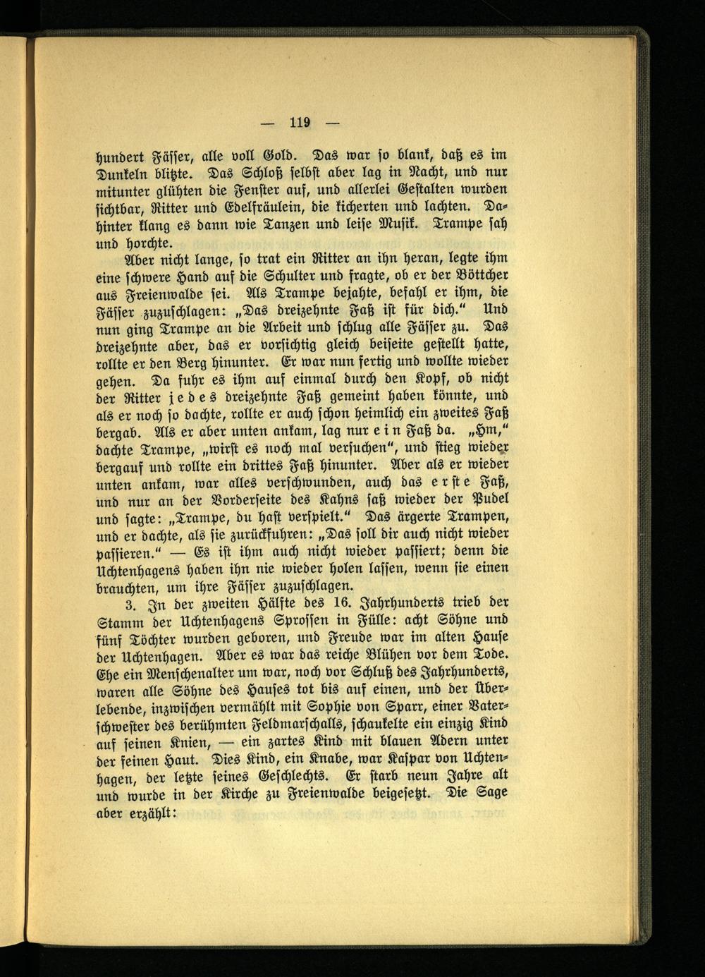 3. In der zweiten Hälfte des 16. Jahrhunderts trieb der Stamm der Uchtenhagens Sprossen in Fülle: acht Söhne und fünf Töchter wurden geboren, und Freude war im alten Hause der Uchtenhagen. Aber es war das reiche Blühen vor dem Tode. Ehe ein Menschenalter um war, noch vor Schluß des Jahrhunderts, waren alle Söhne des Hauses tot bis auf einen, und der Überlebende, inzwischen vermählt mit Sophie von Sparr, einer Bater- schwester des berühmten Feldmarschalls, schaukelte ein einzig Kind auf seinen Knien, — ein zartes Kind mit blauen Adern unter der feinen Haut. Dies Kind, ein Knabe, war Kaspar von Uchtenhagen, der letzte seines Geschlechts. Er starb neun Jahre alt und wurde in der Kirche zu Freienwalde beigesetzt. Die Sage aber erzählt:
