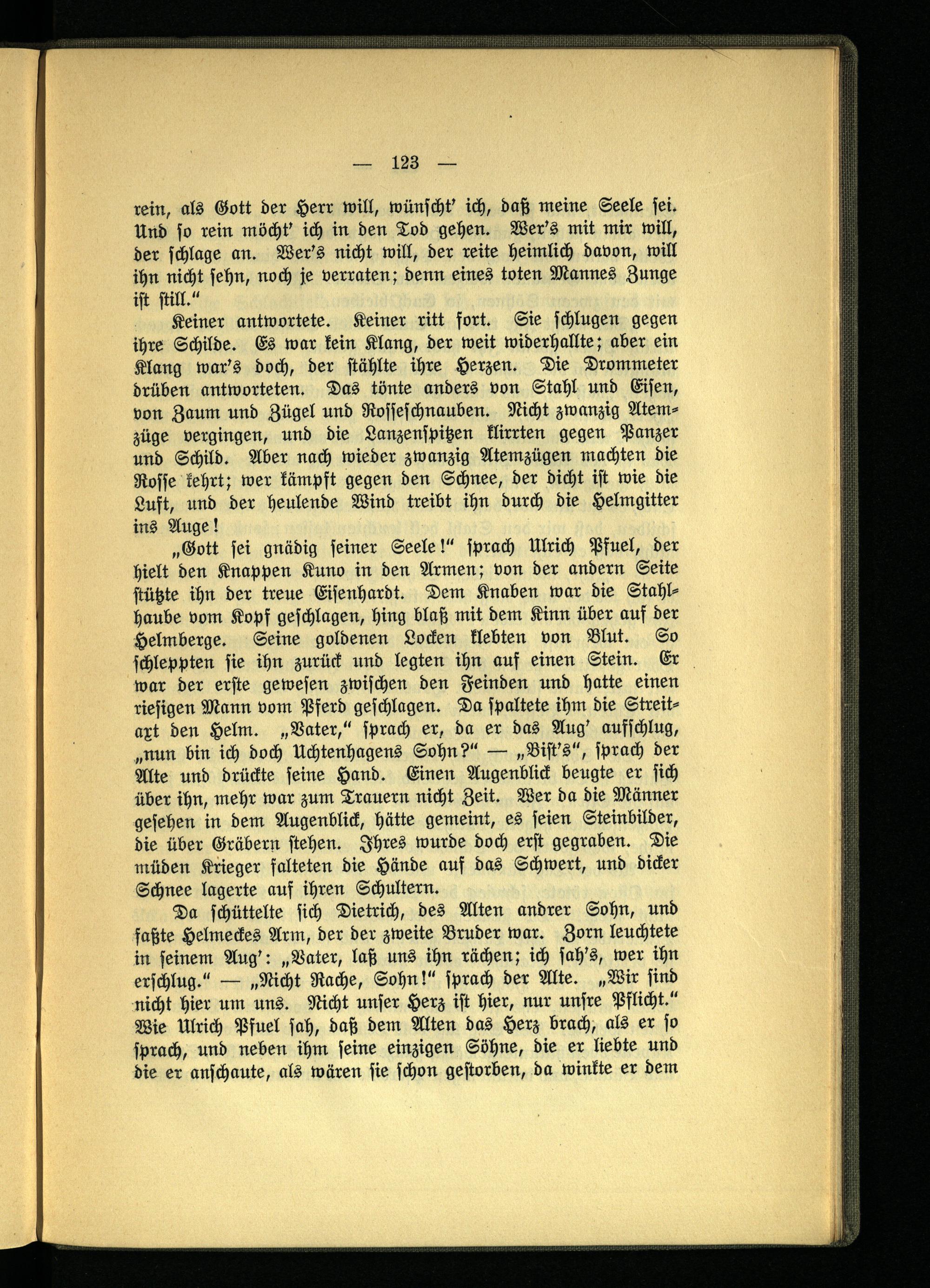 „Gott sei gnädig seiner Seele!" sprach Ulrich Psuel, der hielt den Knappen Kuno in den Armen; von der andern Seite stützte ihn der treue Eisenhardt. Dem Knaben war die Stahlhaube vom Kopf geschlagen, hing blaß mit dem Kinn über auf der Helmberge. Seine goldenen Locken klebten von Blut. So schleppten sie ihn zurück und legten ihn auf einen Stein. Er war der erste gewesen zwischen den Feinden und hatte einen riesigen Mann vom Pferd geschlagen. Da spaltete ihm die Streitaxt den Helm. „Vater," sprach er, da er das Aug' aufschlug, „nun bin ich doch Uchtenhagens Sohn?" — „Bist's", sprach der Alte und drückte seine Hand. Einen Augenblick beugte er sich über ihn, mehr war zum Trauern nicht Zeit. Wer da die Männer gesehen in dem Augenblick, hätte gemeint, es seien Steinbilder, die über Gräbern stehen. Ihres wurde doch erst gegraben. Die müden Krieger falteten die Hände auf das Schwert, und dicker Schnee lagerte auf ihren Schultern.