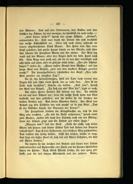 Die edlen Herrn standen still betend vor ihm. Da rieselte es rot aus dem Schnee vor; denn die weiße Decke hatte das Blut versteckt, das hier geflossen, und itzt hoben sie die Leichen der beiden Brüder auf. Aus deren Wunden kam's. Der Graf von Anhalt zog sein Tüchlein vor und taucht' es in das Blut: „Das ist ein köstlicher Quell, der Brunnen der Treue!"
