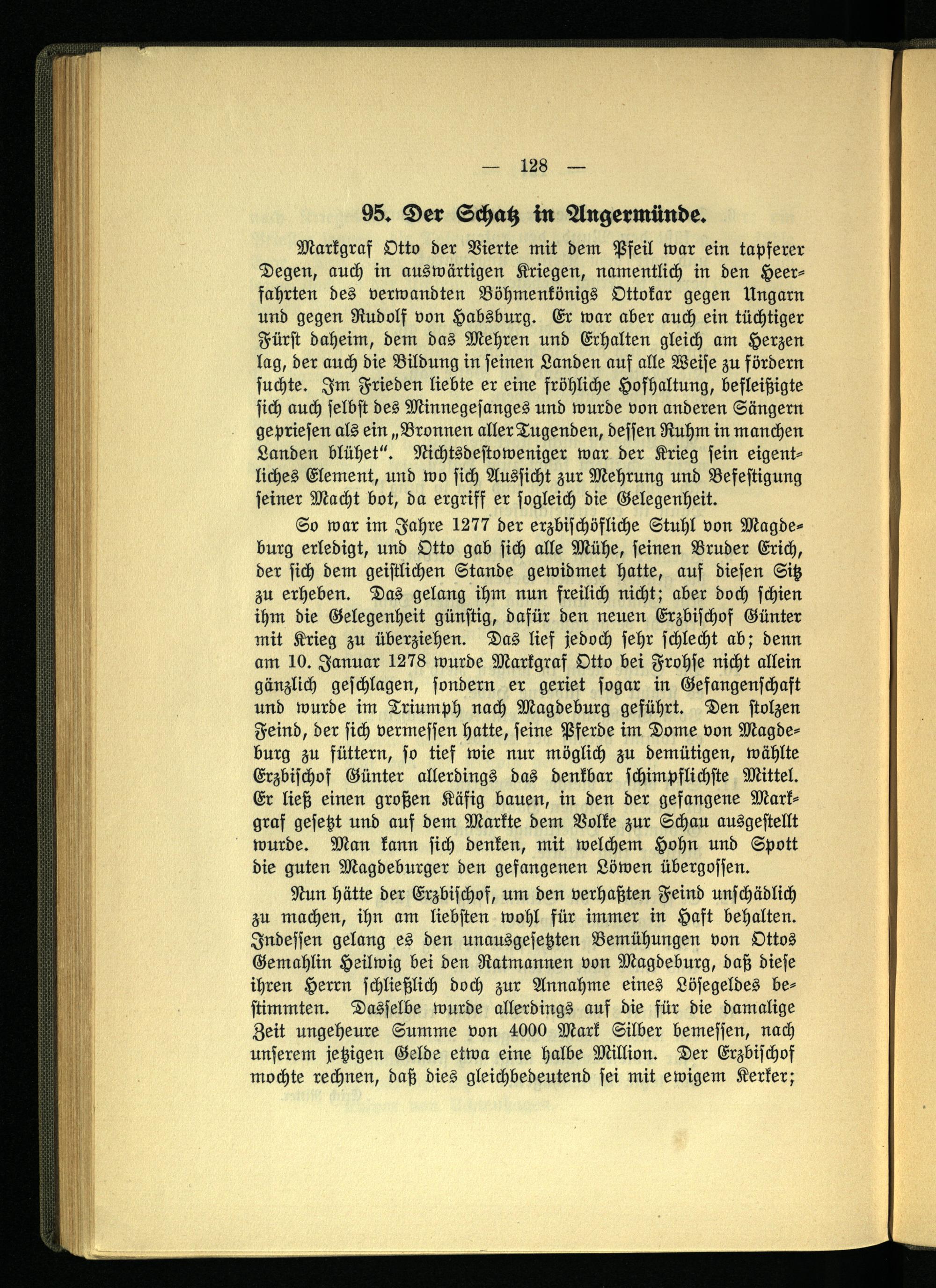 So war im Jahre 1277 der erzbischöfliche Stuhl von Magdeburg erledigt, und Otto gab sich alle Mühe, seinen Bruder Erich, der sich dem geistlichen Stande gewidmet hatte, auf diesen Sitz zu erheben. Das gelang ihm nun freilich nicht; aber doch schien ihm die Gelegenheit günstig, dafür den neuen Erzbischof Günter mit Krieg zu überziehen. Das lief jedoch sehr schlecht ab; denn am 10. Januar 1278 wurde Markgraf Otto bei Frohse nicht allein gänzlich geschlagen, sondern er geriet sogar in Gefangenschaft und wurde im Triumph nach Magdeburg geführt. Den stolzen Feind, der sich vermessen hatte, seine Pferde im Dome von Magdeburg zu füttern, so tief wie nur möglich zu demütigen, wählte Erzbischof Günter allerdings das denkbar schimpflichste Mittel. Er ließ einen großen Käfig bauen, in den der gefangene Markgraf gesetzt und auf dem Markte dem Volke zur Schau ausgestellt wurde. Man kann sich denken, mit welchem Hohn und Spott die guten Magdeburger den gefangenen Löwen übergossen.