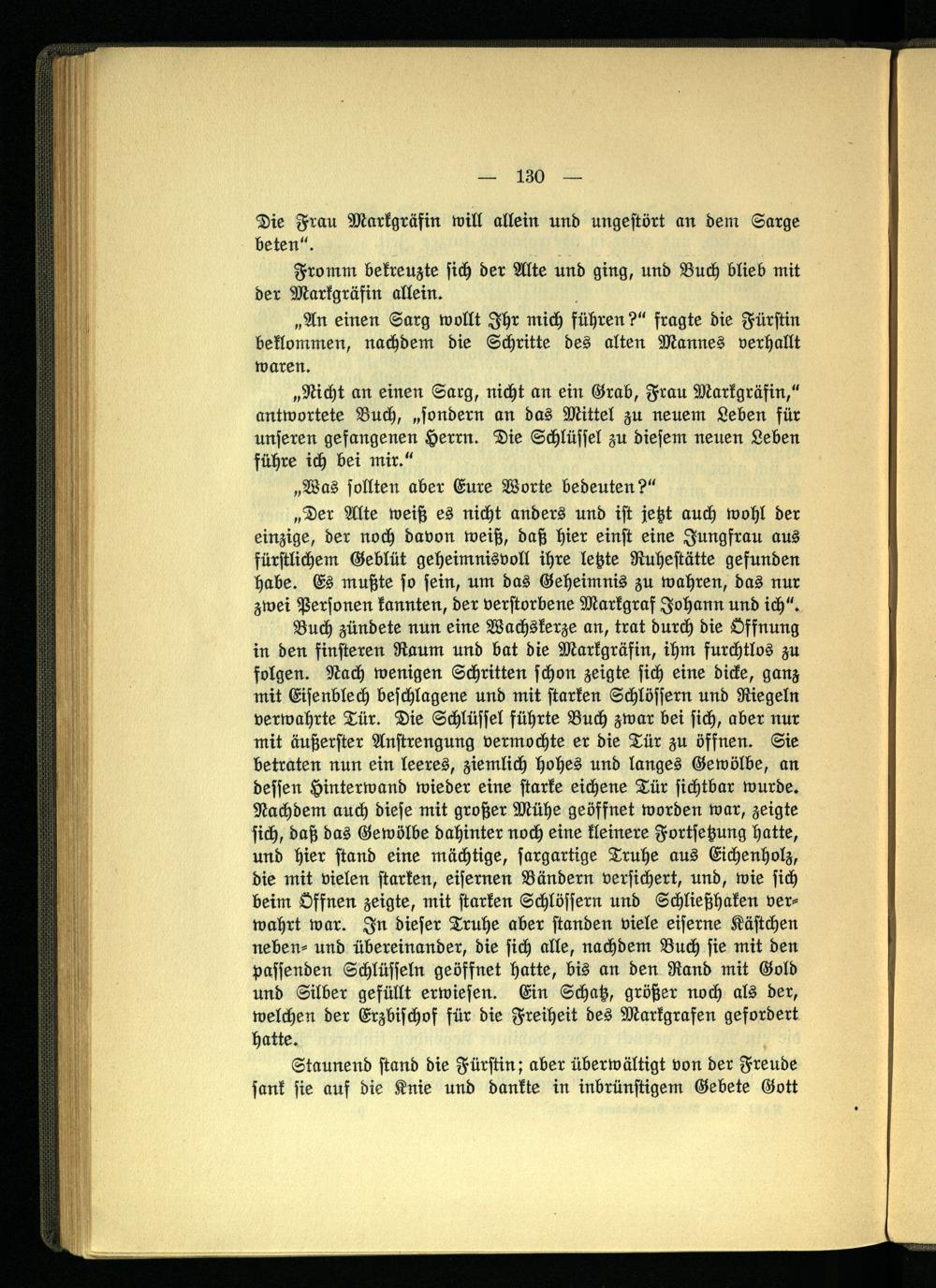 Buch zündete nun eine Wachskerze an, trat durch die Öffnung in den finsteren Raum und bat die Markgräfin, ihm furchtlos zu folgen. Nach wenigen Schritten schon zeigte sich eine dicke, ganz mit Eisenblech beschlagene und mit starken Schlössern und Riegeln verwahrte Tür. Die Schlüssel führte Buch zwar bei sich, aber nur mit äußerster Anstrengung vermochte er die Tür zu öffnen. Sie betraten nun ein leeres, ziemlich hohes und langes Gewölbe, an dessen Hinterwand wieder eine starke eichene Tür sichtbar wurde. Nachdem auch diese mit großer Mühe geöffnet worden war, zeigte sich, daß das Gewölbe dahinter noch eine kleinere Fortsetzung hatte, und hier stand eine mächtige, sargartige Truhe aus Eichenholz, die mit vielen starken, eisernen Bändern versichert, und, wie sich beim Offnen zeigte, mit starken Schlössern und Schließhaken verwahrt war. In dieser Truhe aber standen viele eiserne Kästchen neben- und übereinander, die sich alle, nachdem Buch sie mit den passenden Schlüsseln geöffnet hatte, bis an den Rand mit Gold und Silber gefüllt erwiesen. Ein Schatz, größer noch als der, welchen der Erzbischof für die Freiheit des Markgrafen gefordert hatte.