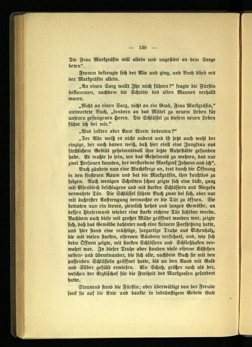 „Der Alte weiß es nicht anders und ist jetzt auch wohl der einzige, der noch davon weiß, daß hier einst eine Jungfrau aus fürstlichem Geblüt geheimnisvoll ihre letzte Ruhestätte gefunden habe. Es mußte so sein, um das Geheimnis zu wahren, das nur zwei Personen kannten, der verstorbene Markgraf Johann und ich".