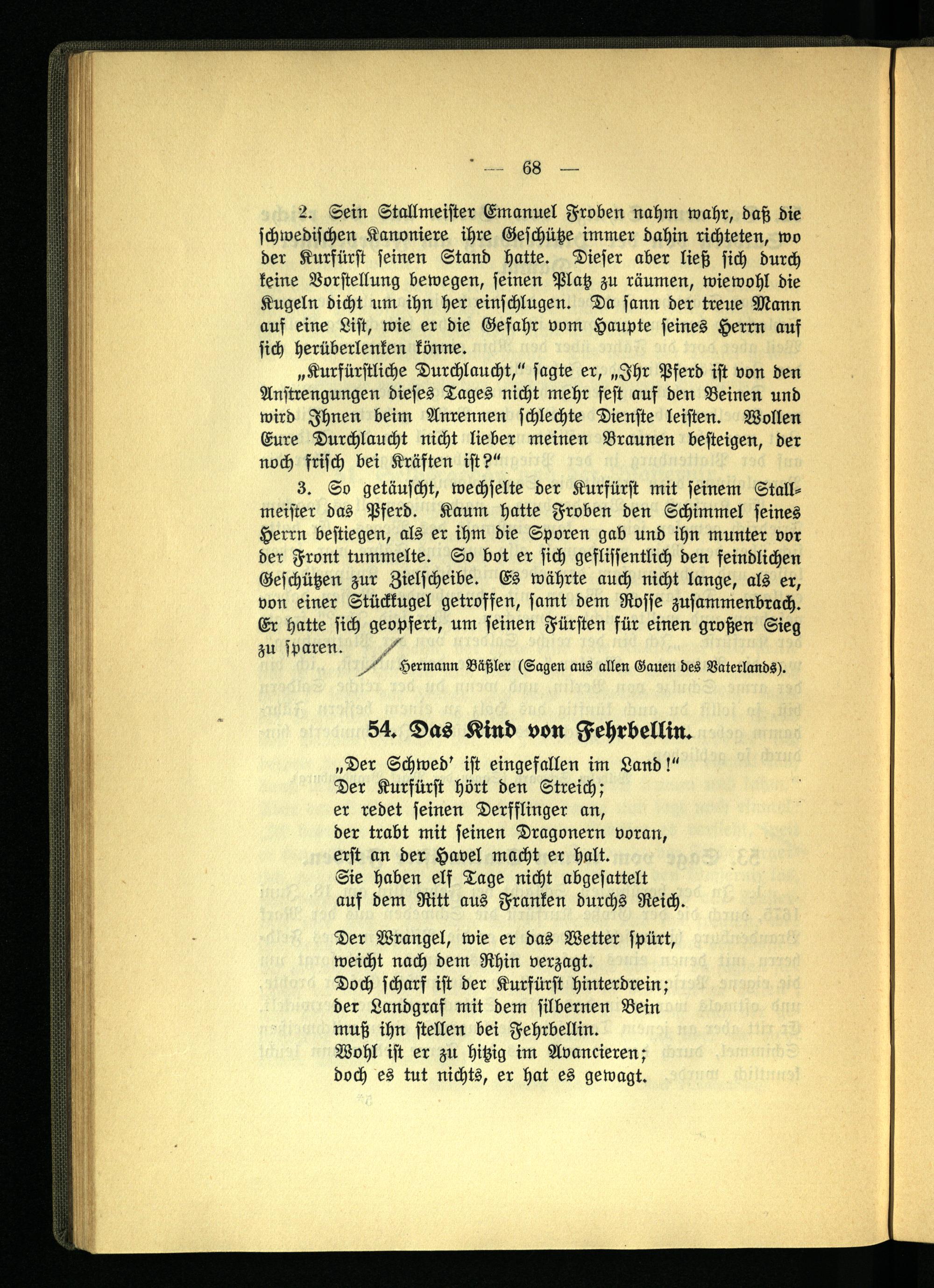 3. So getäuscht, wechselte der Kurfürst mit seinem Stallmeister das Pferd. Kaum hatte Froben den Schimmel seines Herrn bestiegen, als er ihm die Sporen gab und ihn munter vor der Front tummelte. So bot er sich geflissentlich den feindlichen Geschützen zur Zielscheibe. Es währte auch nicht lange, als er, von einer Stückkugel getroffen, samt dem Rosse zusammenbrach. Er hatte sich geopfert, um seinen Fürsten für einen großen Sieg zu sparen.