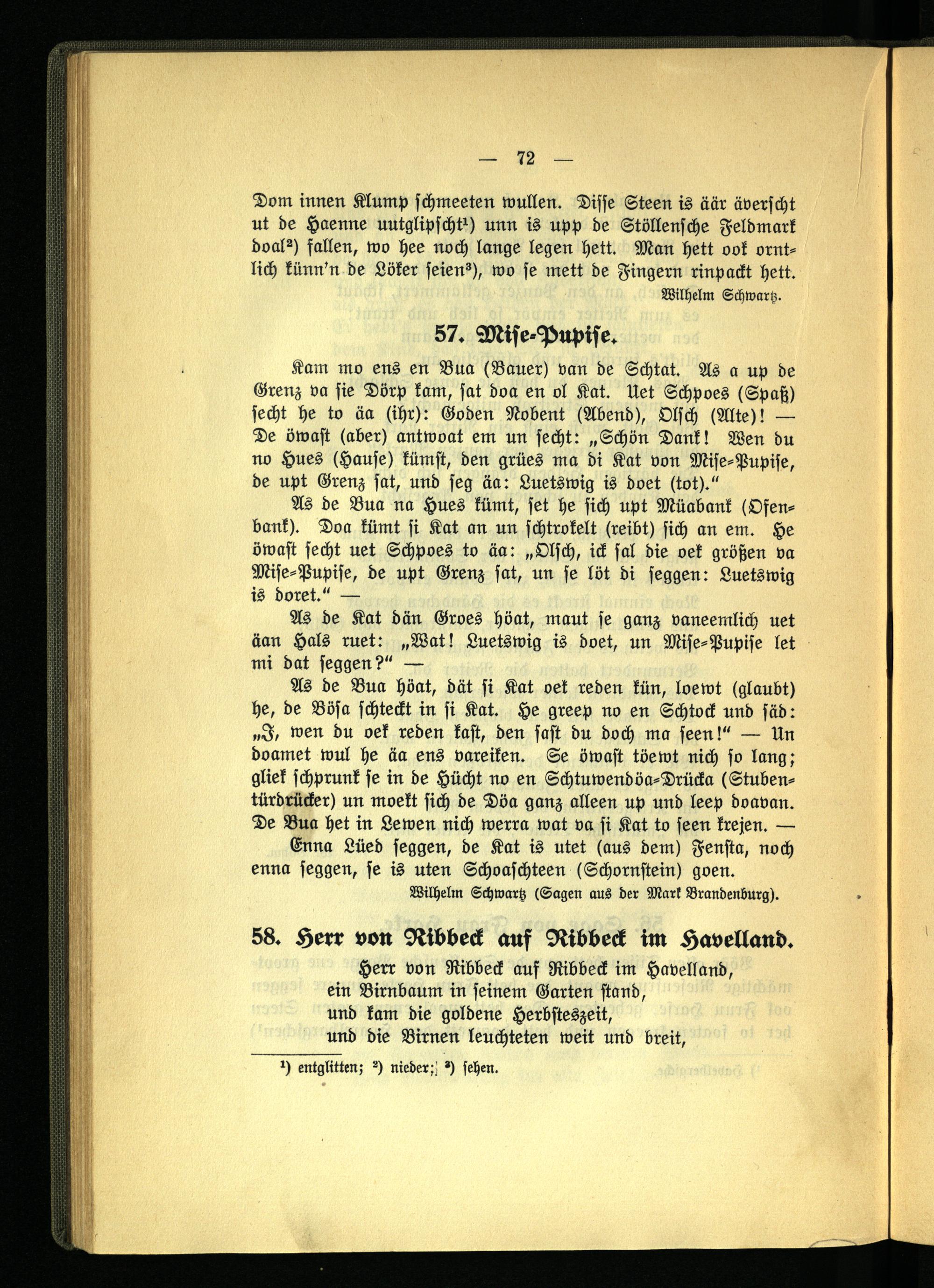 As de Bua höat, dät si Kat oek reden kün, loewt (glaubt) he, de Bösa schteckt in si Kat. He greep no en Schtock und säd: „I, wen du oek reden käst, den säst du doch ma seen!" — Un doamet wul he äa ens vareiken. Se öwast töewt nich so lang; gliek schprunk se in de Hücht no en Schtuwendöa-Drücka (Stubentürdrücker) un moekt sich de Döa ganz alleen up und leep doavan. De Bua het in Lewen nich werra wat va si Kat to seen krejen. —