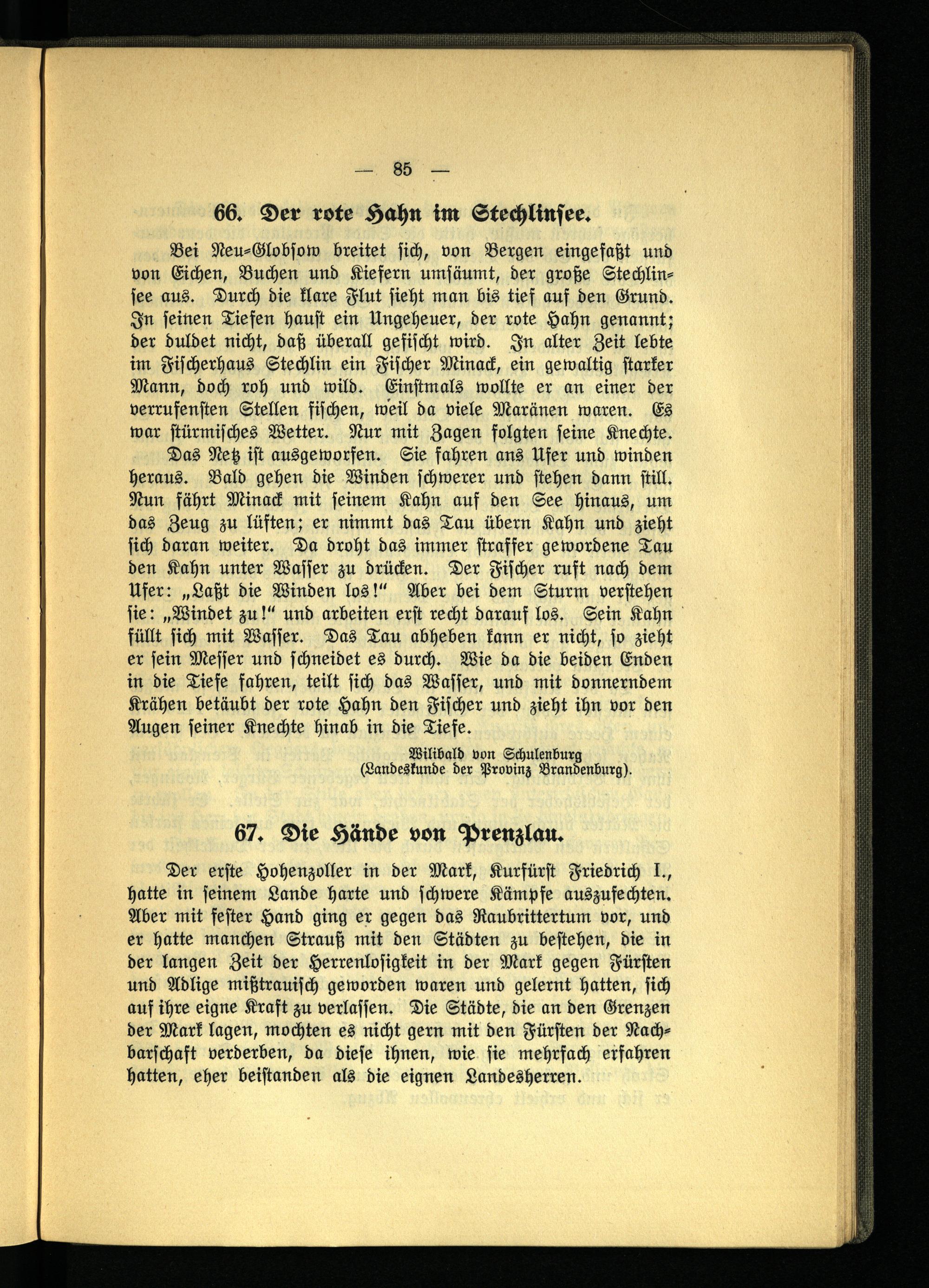 Bei Neu-Globsow breitet sich, von Bergen eingefaßt und von Eichen, Buchen und Kiefern umfäumt, der große Stechlinsee aus. Durch die klare Flut sieht man bis tief auf den Grund. In seinen Tiefen haust ein Ungeheuer, der rote Hahn genannt; der duldet nicht, daß überall gefischt wird. In alter Zeit lebte im Fischerhaus Stechlin ein Fischer Minack, ein gewaltig starker Mann, doch roh und wild. Einstmals wollte er an einer der verrufensten Stellen fischen, weil da viele Maränen waren. Es war stürmisches Wetter. Nur mit Zagen folgten seine Knechte.