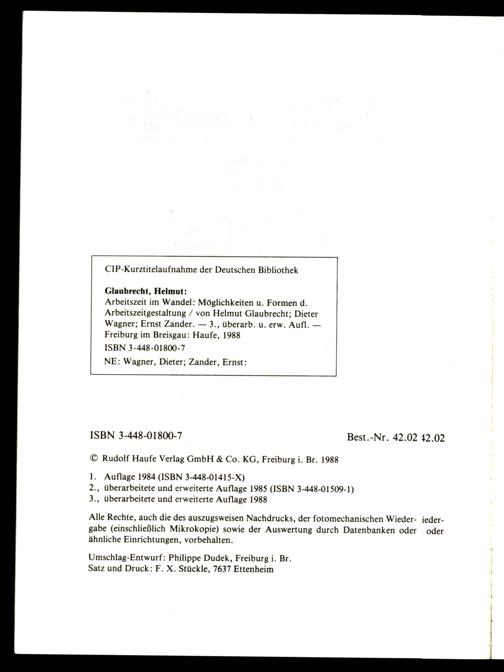 Arbeitszeit im Wandel: Möglichkeiten u. Formen d. Arbeitszeitgestaltung/ von Helmut Glaubrecht; Dieter Wagner; Ernst Zander.— 3., überarb. u. erw. Aufl.— Freiburg im Breisgau: Haufe, 1988