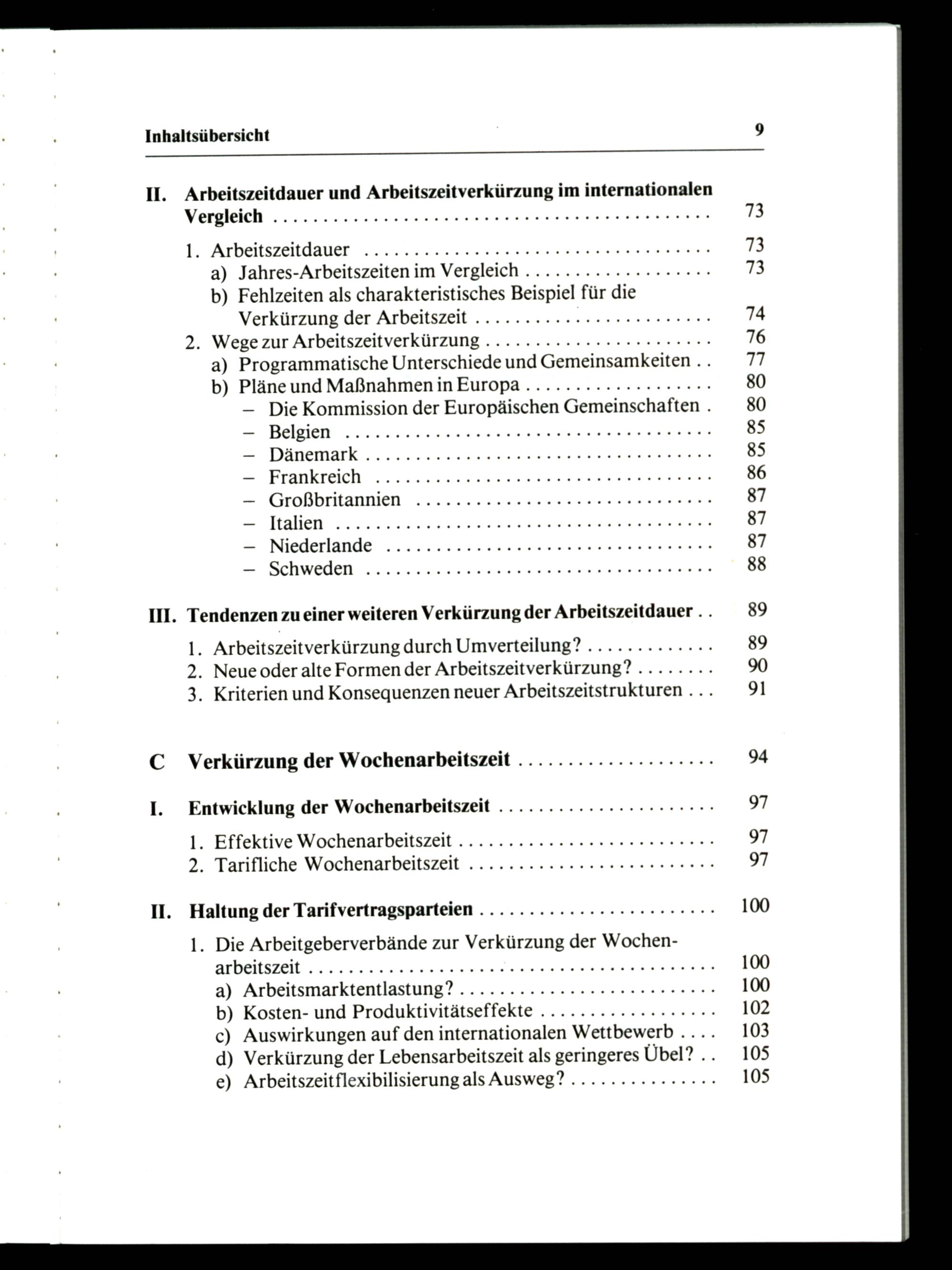 Vergleich...........0.000000000000 00H 73 1. Arbeitszeitdauer.........0.000000000000 00H 73 a) Jahres-Arbeitszeiten im Vergleich.................+- 73 b) Fehlzeiten als charakteristisches Beispiel für die Verkürzung der Arbeitszeit..............0.0000000000 74 2. Wege zur Arbeitszeitverkürzung............0..0000040400 76 a) Programmatische Unterschiede und Gemeinsamkeiten.. 77 b) Pläne und Maßnahmen in Europa.............000044 4 80 — Die Kommission der Europäischen Gemeinschaften. 80 — Belgien........0.0.00000000000 0ER 85 — Dänemark 4.....0.0000 KLEE REKEN 85 — Frankreich.............0000000040 043000000000 86 — Großbritannien......0.00000000000000 00000 87 1 87 — Niederlande...............0000000411000044004 87 — SCHWEdEN az. ue er EHE HEN 88 Il. Tendenzen zu einer weiteren Verkürzung der Arbeitszeitdauer.. 89 1. Arbeitszeitverkürzung durch Umverteilung?............. 89 2. Neue oder alte Formen der Arbeitszeitverkürzung?........ 90 3. Kriterien und Konsequenzen neuer Arbeitszeitstrukturen... 91 C Verkürzung der Wochenarbeitszeit................... 94 I. Entwicklung der Wochenarbeitszeit..............0.0000440 97 1. Effektive Wochenarbeitszeit.............0.0000000004000 97 2. Tarifliche Wochenarbeitszeit..............0.0..000000044 97 II. Haltung der Tarifvertragsparteien...............000004044 4 100 1. Die Arbeitgeberverbände zur Verkürzung der WochenarbeitsZeit......0..0000044000 HT EEEEEE KENT 100 a) Arbeitsmarktentlastung?...............0.00000000004 100 b) Kosten- und Produktivitätseffekte.................. 102 c) Auswirkungen auf den internationalen Wettbewerb.... 103 d) Verkürzung der Lebensarbeitszeit als geringeres Übel?.. 105