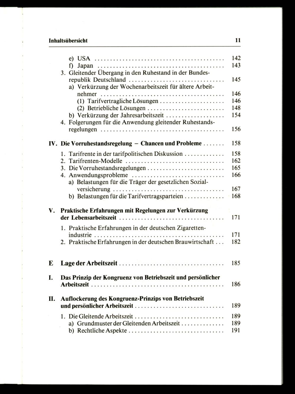 A TU TUN 143 3. Gleitender Übergang in den Ruhestand in der Bundesrepublik Deutschland var 145 a) Verkürzung der Wochenarbeitszeit für ältere ArbeitNCHMET 2010er EEE 146 (1) Tarifvertragliche Lösungen.................0.0000 146 (2) Betriebliche Lösungen........0..0000000000000444 148 b) Verkürzung der Jahresarbeitszeit................... 154 4. Folgerungen für die Anwendung gleitender RuhestandsregelungeN..........0000004410000 EEE 156 Die Vorruhestandsregelung— Chancen und Probleme....... 158 1. Tarifrente in der tarifpolitischen Diskussion............. 158 2. Tarifrenten-Modelle 1.0.0000. 162 3. Die Vorruhestandsregelungen..........0.000000000000444 165 4. Anwendungsprobleme ‚0.0... 166 a) Belastungen für die Träger der gesetzlichen Sozialversicherunß 40 FREE EEE BEE 167 b) Belastungen für die Tarifvertragsparteien............. 168 Praktische Erfahrungen mit Regelungen zur Verkürzung