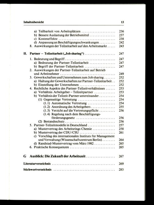 förderungsgesetZ....00000000 400 Ea KEG (2) BestandsschutZ.........0.0000000000000000000444 5. Partner-Teilzeitmodelle in Deutschland................. a) Mustervertrag des Arbeitsrings Chemie.............. b) Mustervertrag der CDU/CSU e...0000e c) Vorschlag des internationalen Instituts für Management und Verwaltung(Wissenschaftszentrum Berlin)........ d) Randstad-Mustervertrag vom März 1982............. 6. Praktische Konsequenzen.........0.000000000000000000