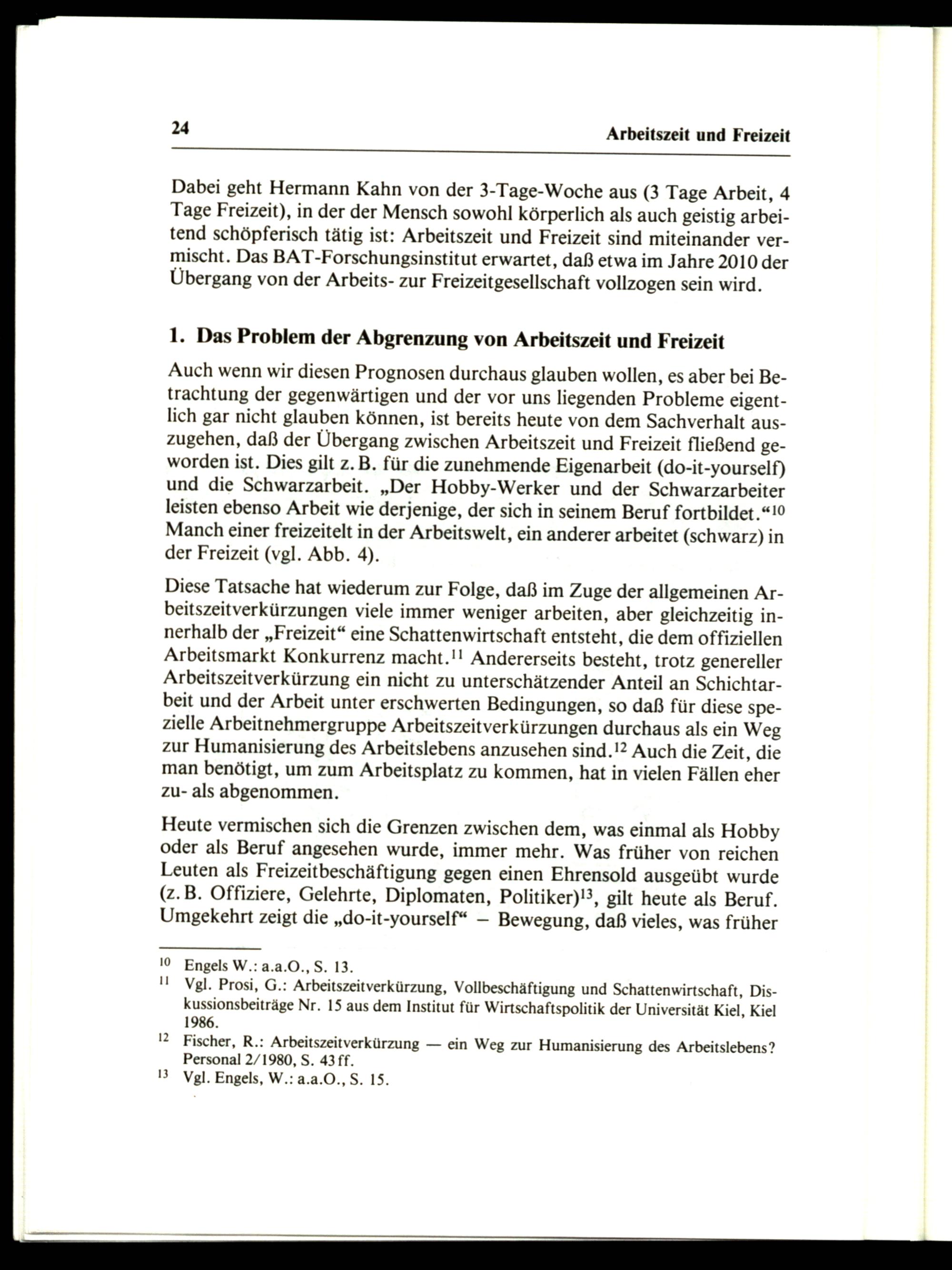 Dabei geht Hermann Kahn von der 3-Tage-Woche aus(3 Tage Arbeit, 4 Tage Freizeit), in der der Mensch sowohl körperlich als auch geistig arbeitend schöpferisch tätig ist: Arbeitszeit und Freizeit sind miteinander vermischt. Das BAT-Forschungsinstitut erwartet, daß etwa im Jahre 2010 der Übergang von der Arbeits- zur Freizeitgesellschaft vollzogen sein wird.