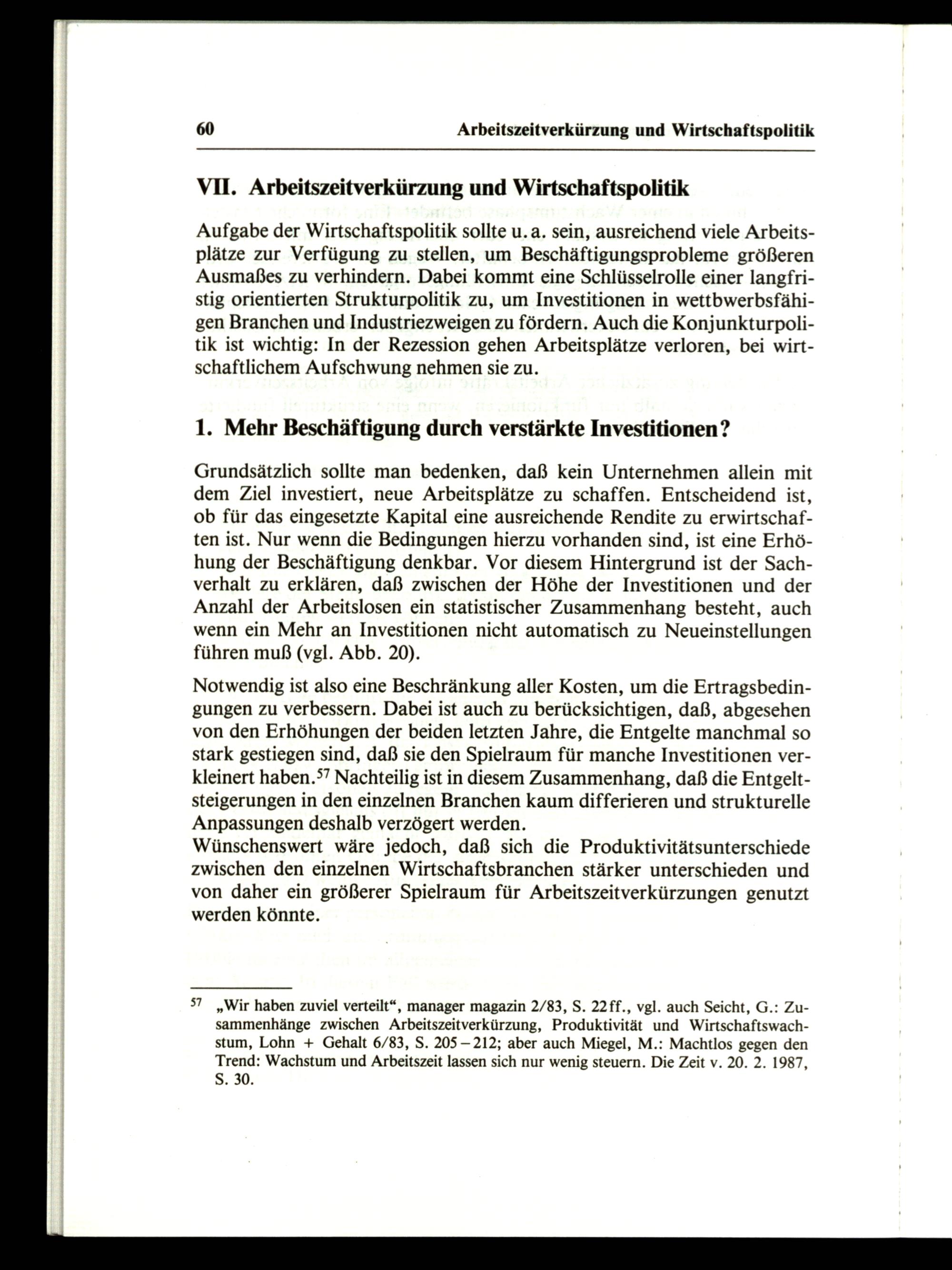 57„Wir haben zuviel verteilt“, manager magazin 2/83, S. 22ff., vgl. auch Seicht, G.: Zusammenhänge zwischen Arbeitszeitverkürzung, Produktivität und Wirtschaftswachstum, Lohn+ Gehalt 6/83, S. 205— 212; aber auch Miegel, M.: Machtlos gegen den Trend: Wachstum und Arbeitszeit lassen sich nur wenig steuern. Die Zeit v. 20. 2. 1987, Ss. 30.