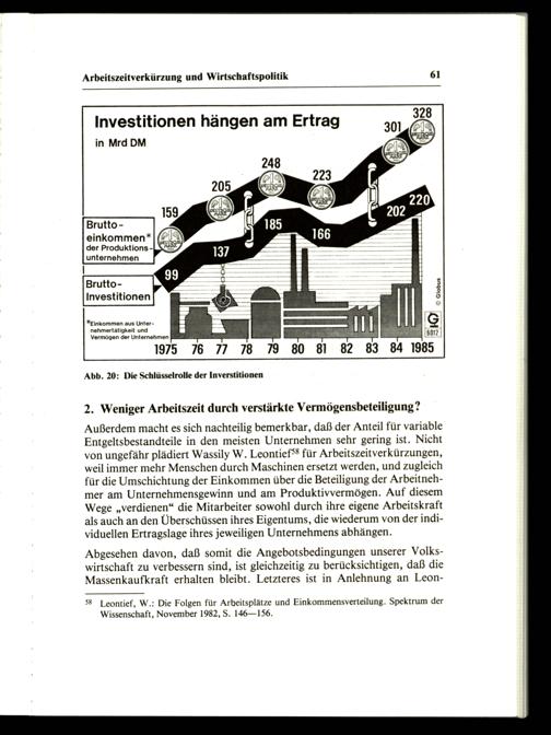 Außerdem macht es sich nachteilig bemerkbar, daß der Anteil für variable Entgeltsbestandteile in den meisten Unternehmen sehr gering ist. Nicht von ungefähr plädiert Wassily W. Leontief® für Arbeitszeitverkürzungen, weil immer mehr Menschen durch Maschinen ersetzt werden, und zugleich für die Umschichtung der Einkommen über die Beteiligung der Arbeitnehmer am Unternehmensgewinn und am Produktivvermögen. Auf diesem Wege„verdienen“ die Mitarbeiter sowohl durch ihre eigene Arbeitskraft als auch an den Überschüssen ihres Eigentums, die wiederum von der individuellen Ertragslage ihres jeweiligen Unternehmens abhängen.