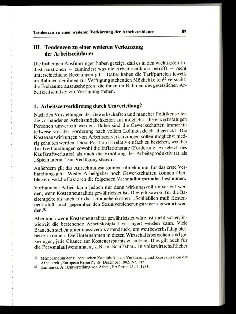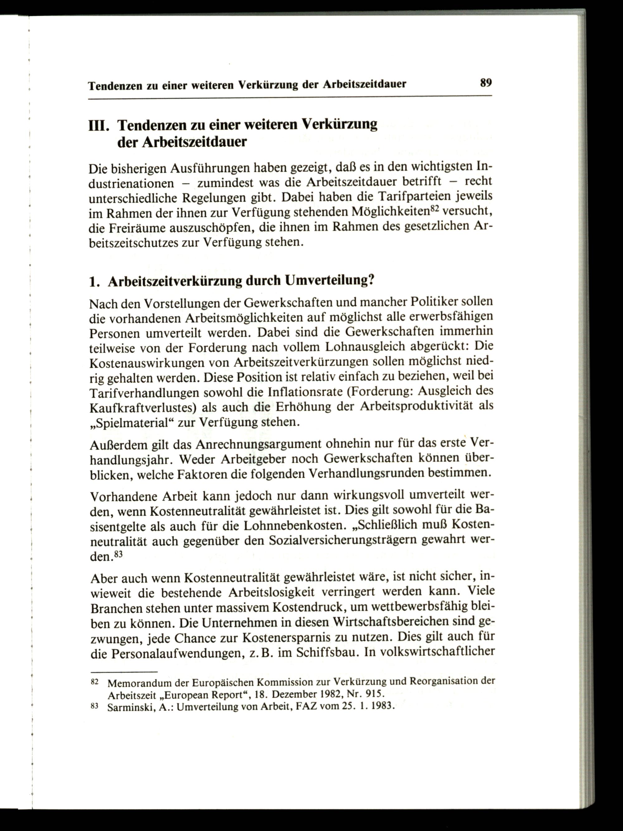 82 Memorandum der Europäischen Kommission zur Verkürzung und Reorganisation der Arbeitszeit„European Report“, 18. Dezember 1982, Nr. 915. 83 Sarminski, A.: Umverteilung von Arbeit, FAZ vom 25. 1. 1983.
