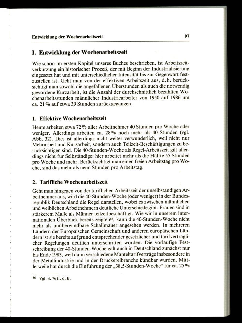 Geht man hingegen von der tariflichen Arbeitszeit der unselbständigen Arbeitnehmer aus, wird die 40-Stunden-Woche(oder weniger) in der Bundesrepublik Deutschland die Regel darstellen, wobei es zwischen männlichen und weiblichen Arbeitnehmern deutliche Unterschiede gibt. Frauen sind in stärkerem Maße als Männer teilzeitbeschäftigt. Wie wir in unserem internationalen Überblick bereits zeigten®, kann die 40-Stunden-Woche nicht mehr als unüberwindbare Schallmauer angesehen werden. In mehreren Ländern der Europäischen Gemeinschaft und anderen europäischen Ländern ist sie bereits aufgrund entsprechender gesetzlicher und tarifvertraglicher Regelungen deutlich unterschritten worden. Die vorläufige Festschreibung der 40-Stunden-Woche galt auch in Deutschland zunächst nur bis Ende 1983, weil dann verschiedene Manteltarifverträge insbesondere in der Metallindustrie und in der Druckereibranche kündbar wurden. Mittlerweile hat durch die Einführung der„38,5-Stunden-Woche“ für ca. 25%