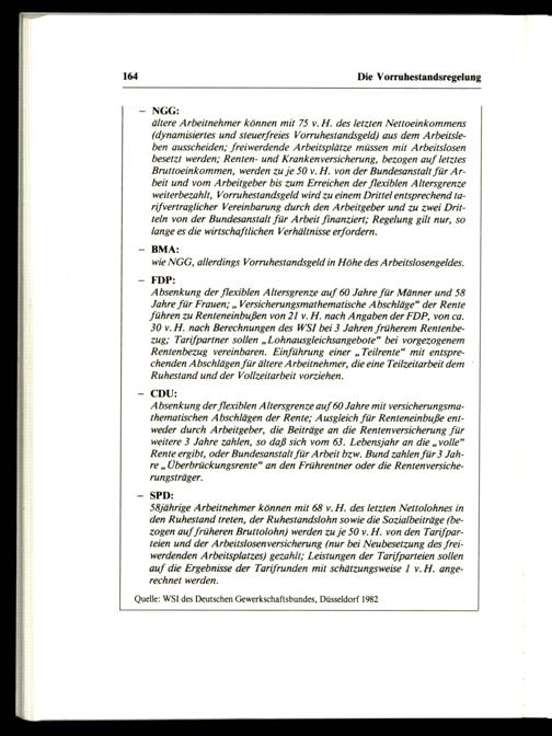 58jährige Arbeitnehmer können mit 68 v. H. des letzten Nettolohnes in den Ruhestand treten, der Ruhestandslohn sowie die Sozialbeiträge(bezogen auf früheren Bruttolohn) werden zu je 50 v. H. von den Tarifparteien und der Arbeitslosenversicherung(nur bei Neubesetzung des freiwerdenden Arbeitsplatzes) gezahlt; Leistungen der Tarifparteien sollen auf die Ergebnisse der Tarifrunden mit schätzungsweise 1 v.H. angerechnet werden.