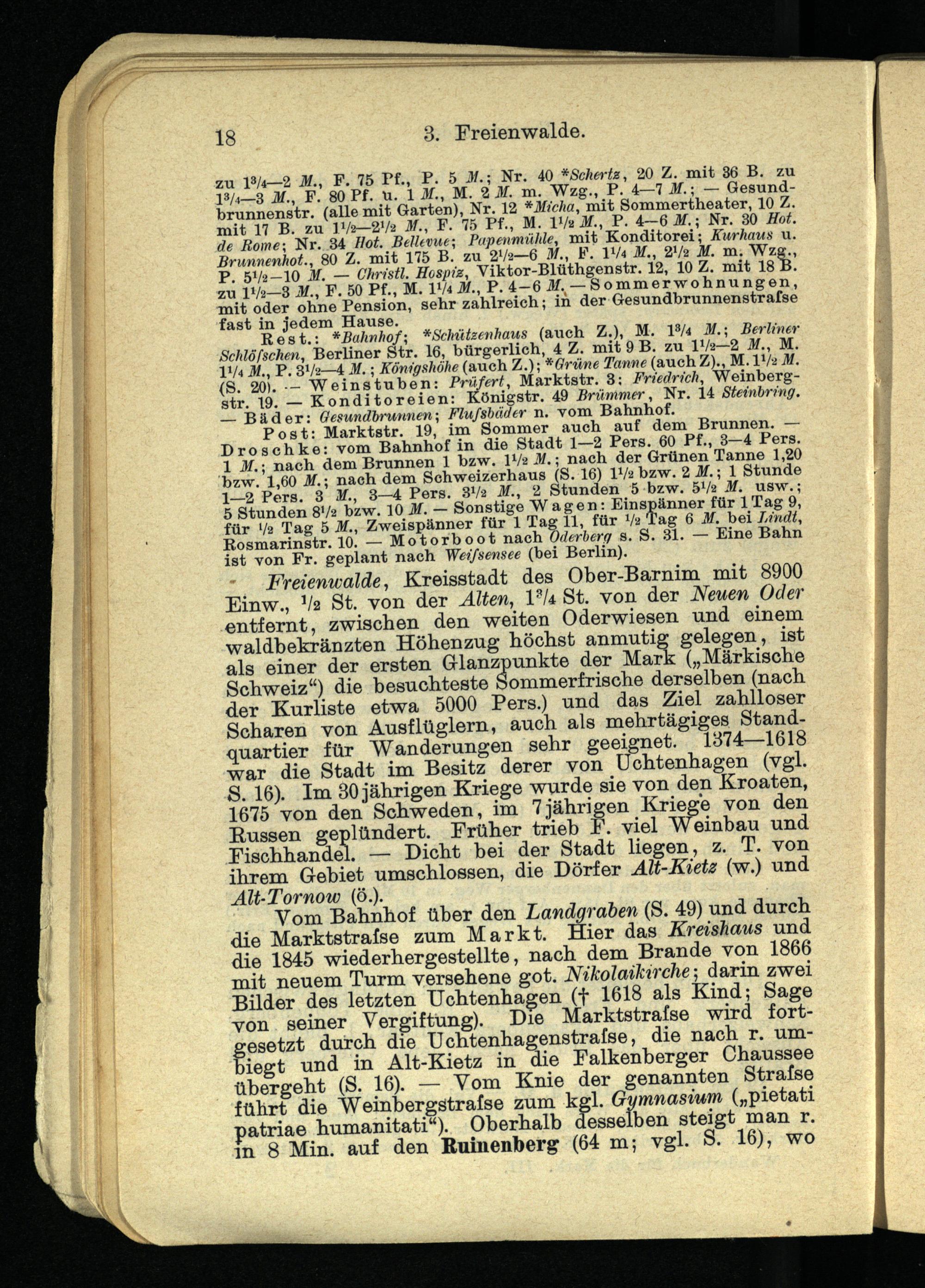 Freienwalde , Kreisstadt des Ober-Barnim mit 8900 Einw., Va St. von der Alten , Vk St. von der Neuen Oder entfernt, zwischen den weiten Oderwiesen und einem waldbekränzten Höhenzug höchst anmutig gelegen, ist als einer der ersten Glanzpunkte der Mark („Märkische Schweiz“) die besuchteste Sommerfrische derselben (nach der Kurliste etwa 5000 Pers.) und das Ziel zahlloser Scharen von Ausflüglern, auch als mehrtägiges Standquartier für Wanderungen sehr geeignet. 1374—1618 war die Stadt im Besitz derer von Uchtenhagen (vgl. S. 16). Im 30 jährigen Kriege wurde sie von den Kroaten, 1675 von den Schweden, im 7 jährigen Kriege von den Russen geplündert. Früher trieb F. viel Weinbau und Fischhandel. — Dicht bei der Stadt liegen, z. T. von ihrem Gebiet umschlossen, die Dörfer Alt-Kietz (w.) und Alt-Tornow (ö.).