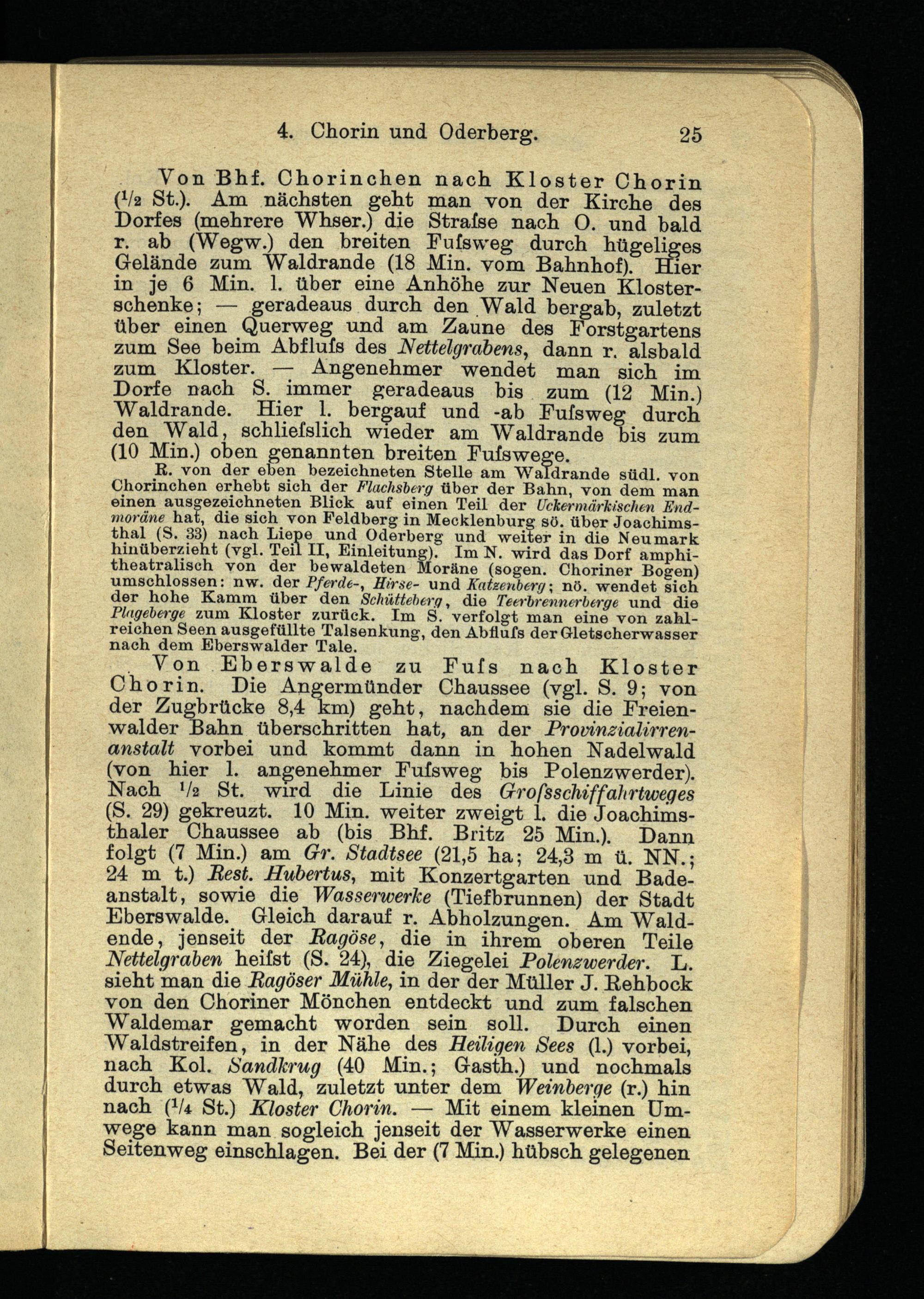 Von Eberswalde zu Fufs nach Kloster Chorin. Die Angermünder Chaussee (vgl. 8. 9; von der Zugbrücke 8,4 km) geht, nachdem sie die Freien- walder Bahn überschritten hat, an der Provinzialirrenanstalt vorbei und kommt dann in hohen Nadelwald (von hier 1. angenehmer Fufsweg bis Polenzwerder). Nach V 2 St. wird die Linie des Grofsschiffahrtweges (S. 29) gekreuzt. 10 Min. weiter zweigt 1. die Joachims- thaler Chaussee ab (bis Bhf. Britz 25 Min.). Dann folgt (7 Min.) am Gr. Stadtsee (21,5 ha; 24,3 m ü. NN.; 24 m t.) Best. Hubertus, mit Konzertgarten und Badeanstalt, sowie die Wasserwerke (Tiefbrunnen) der Stadt Eberswalde. Gleich darauf r. Abholzungen. Am Waldende, jenseit der Bagöse, die in ihrem oberen Teile Netteigraben heilst (S. 24), die Ziegelei Polenz vier der. L. sieht man die Bagöser Mühle, in der der Müller J. Rehbock von den Choriner Mönchen entdeckt und zum falschen Waldemar gemacht worden sein soll. Durch einen Waldstreifen, in der Nähe des Heiligen Sees (1.) vorbei, nach Kol. Sandkrug (40 Min.; Gasth.) und nochmals durch etwas Wald, zuletzt unter dem Weinberge (r.) hin nach (Vi St.) Kloster Chorin. — Mit einem kleinen Umwege kann man sogleich jenseit der Wasserwerke einen Seitenweg einschlagen. Bei der (7 Min.) hübsch gelegenen