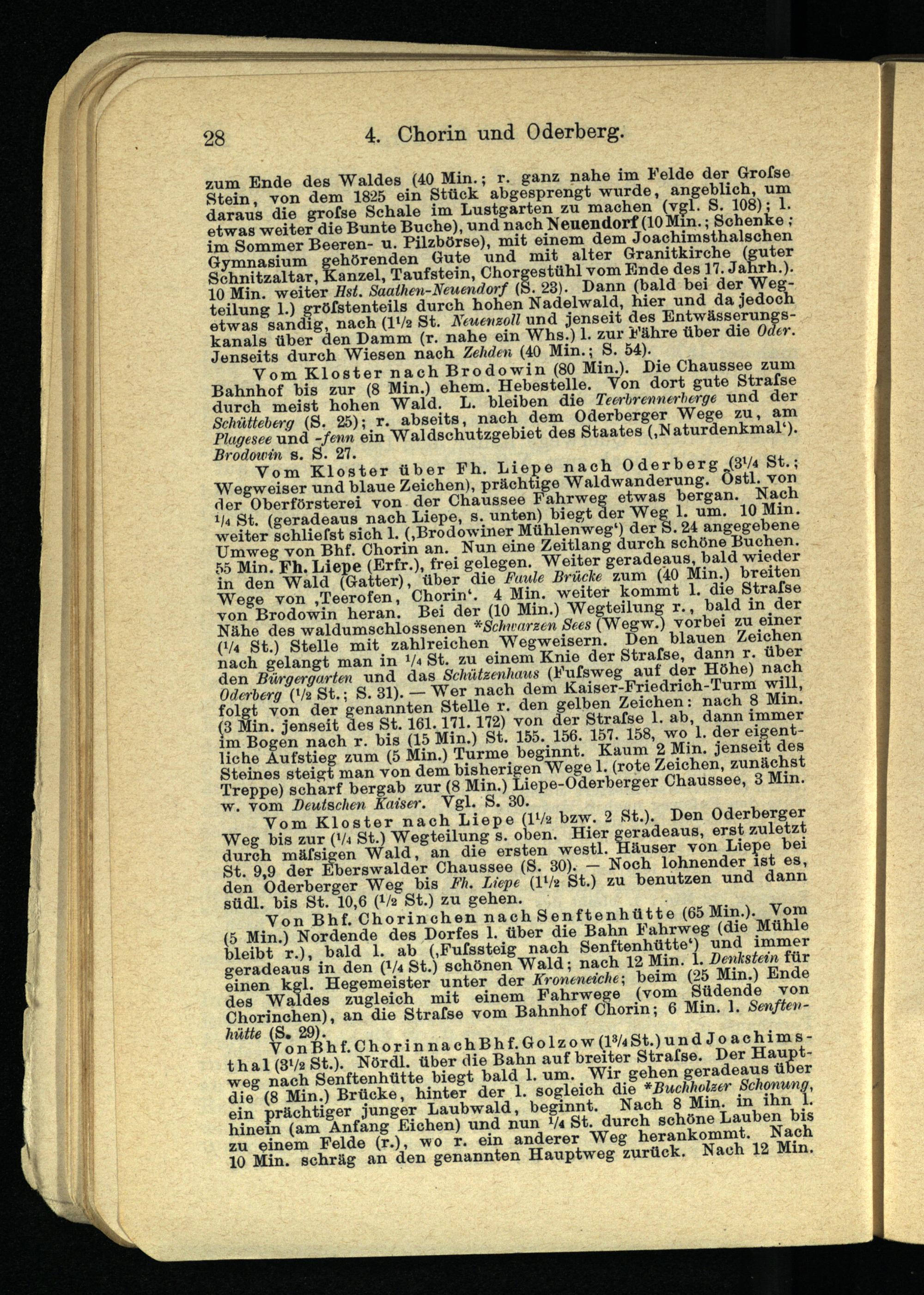 Vom Kloster über Fh. Liepe nach 0derberg ( 3 l /4 St.; Wegweiser und blaue Zeichen), prächtige Waldwanderung, östl. von der Oberförsterei von der Chaussee Fahrweg etwas bergan. Nach 1 h St. (geradeaus nach Liepe, s. unten) biegt der Weg 1. um. 10 Min. weiter schliefst sich 1. (,Brodowiner Mühlenweg 1 ) der S. 24 angegebene Umweg von Bhf. Chorin an. Nun eine Zeitlang durch schöne Buchen. 55 Min. Fh. Liepe (Erfr.), frei gelegen. Weiter geradeaus, bald wieder in den Wald (Gatter), über die Faule Brücke zum ("40 Min.) breiten Wege von ,Teerofen, Chorin 4 . 4 Min. weiter kommt 1. die Strafse von Brodowin heran. Bei der (10 Min.) Wegteilung r., bald in der Nähe des waldumschlossenen *Schwarzen Sees (Wegw.) vorbei zu einer i}/4 St.) Stelle mit zahlreichen "Wegweisern. Den blauen Zeichen nach gelangt man in V 4 St. zu einem Knie der Strafse, dann r. Über den Bürgergarten und das ScMttzenhaus (Fufsweg auf der Höhe) nach Oderberg ( l /s St.; S. 31). — Wer nach dem Kaiser-Friedrich-Turm will, folgt von der genannten Stelle r. den gelben Zeichen: nach 8 Min. (3 Min. jenseit des St. 161.171.172) von der Strafse 1. ab, dann immer im Bogen nach r. bis (15 Min.) St. 155. 156. 157. 158, wo 1. der eigentliche Aufstieg zum (5 Min.) Turme beginnt. Kaum 2 Min. jenseit des Steines steigt man von dem bisherigen Wege 1. (rote Zeichen, zunächst Treppe) scharf bergab zur (8 Min.) Liepe-Oderberger Chaussee, 3 Min. w. vom Deutschen. Kaiser. Vgl. S. 30.