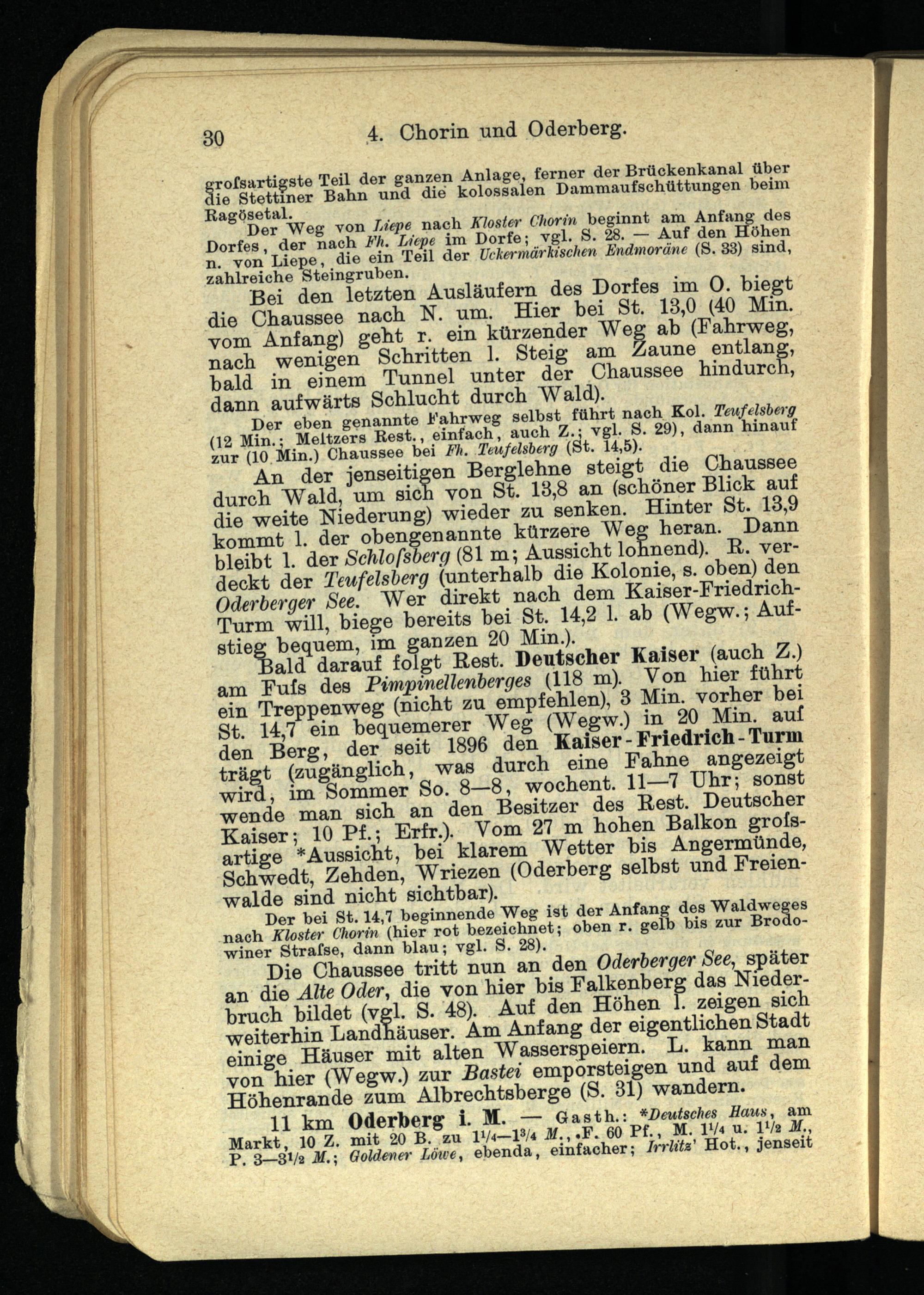 Bald darauf folgt Best. Deutscher Kaiser (auch Z.) am Fufs des Pimpinellenberges (118 m). Von hier führt ein Treppenweg (nicht zu empfehlen), 3 Min. vorher bei St. 14,7 ein bequemerer Weg (Wegw.) in 20 Min. auf den Berg, der seit 1896 den Kaiser-Friedrich-Turm trägt (zugänglich, was durch eine Fahne angezeigt wird, im Sommer So. 8—8, wochent. 11—7 Uhr; sonst wende man sich an den Besitzer des Best. Deutscher Kaiser; 10 Pf.; Erfr.). Vom 27 m hohen Balkon grofs- artige * Aussicht, bei klarem Wetter bis Angermtinde, Schwedt, Zehden, Wriezen (Oderberg selbst und Freienwalde sind nicht sichtbar).