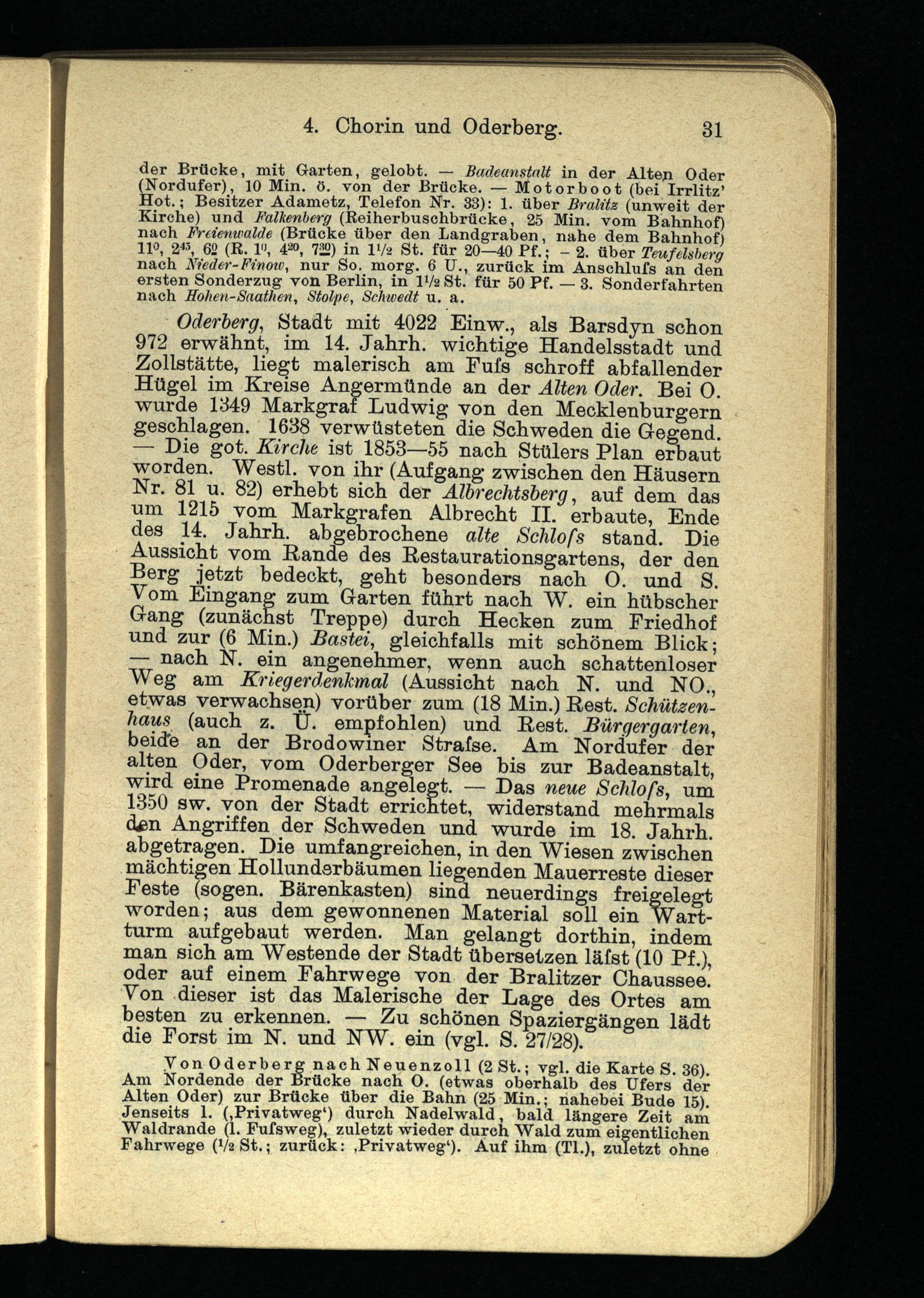 — nach N. ein angenehmer, wenn auch schattenloser Weg am Kriegerdenkmal (Aussicht nach N. und NO., etwas verwachsen) vorüber zum (18 Min.) Rest. Schüteen- haus (auch z. Ü. empfohlen) und Rest. Bürgergarten, beide an der Brodowmer Strafse. Am Nordufer der alten Oder, vom Oderberger See bis zur Badeanstalt, wird eine Promenade angelegt. — Das neue Schlofs, um 1350 sw. von der Stadt errichtet, widerstand mehrmals cUn Angriffen der Schweden und wurde im 18. Jahrh. abgetragen. Die umfangreichen, in den Wiesen zwischen mächtigen Hollunderbäumen liegenden Mauerreste dieser Feste (sogen. Bärenkasten) sind neuerdings freigelegt worden; aus dem gewonnenen Material soll ein Wartturm aufgebaut werden. Man gelangt dorthin, indem man sich am Westende der Stadt übersetzen läfst (10 Pf.), oder auf einem Fahrwege von der Bralitzer Chaussee. Von dieser ist das Malerische der Lage des Ortes am besten zu erkennen. — Zu schönen Spaziergängen lädt die Forst im N. und NW. ein (vgl. S. 27/28).